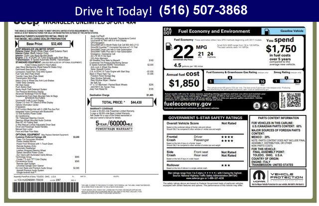 Hit the road - or trail - in this Certified 2021 Jeep Wrangler Unlimited Sport S! One Owner and built for adventure with iconic style, open-air freedom, and rugged capability. Ready for your next escape? This Wrangler wont wait. Come experience the ride! Every Westbury Pre-owned vehicle is thoroughly checked and reconditioned. All this vehicle needs is you!BUY WITH CONFIDENCE7-Year/100,000-Mile Powertrain Limited warranty, Rental Car Allowance, 24-Hour Towing and Roadside Assistance, Carfax Vehicle History Report, 3-Month/3,000-Mile Maximum Care Coverage, Introductory 3-month subscription to SiriusXM Satellite RadioOPTION PACKAGESQUICK ORDER PACKAGE 22S SPORT S Engine: 2.0L I4 DOHC DI Turbo w/ESS, Transmission: 8-Speed Automatic (850RE), Front 1-Touch Down Power Windows, Speed Sensitive Power Locks, Sport S, Power Heated Mirrors, Automatic Headlamps, Leather Wrapped Steering Wheel, Security Alarm, Remote Keyless Entry, Sun Visors w/Illuminated Vanity Mirrors, TRANSMISSION: 8-SPEED AUTOMATIC (850RE) Anti-Lock 4-Wheel Disc Brakes, 8.4 RADIO & PREMIUM AUDIO GROUP Emergency/Assistance Call, Alpine Premium Audio System, Rear View Auto Dim Mirror, BLACK 3-PIECE HARD TOP Freedom Panel Storage Bag, Rear Window Defroster, Rear Window Wiper/Washer, No Soft Top, TECHNOLOGY GROUP Google Android Auto, Cluster 7.0 TFT Color Display, SiriusXM Satellite Radio, SiriusXM Radio Service, For More Info, Call 800-643-2112, USB Host Flip, Integrated Center Stack Radio, 7.0 Touchscreen Display, Air Conditioning w/Auto Temp Control, Radio: Uconnect 4 w/7 Display, Apple Carplay, Air Filtering, GPS Antenna Input, CONVENIENCE GROUP Universal Garage Door Opener, WHEELS: 17 X 7.5 MACHINED/PAINTED BLACK, RADIO: UCONNECT 4C NAV W/8.4 DISPLAY, ENGINE: 2.0L I4 DOHC DI TURBO W/ESS.KEY FEATURES INCLUDE4x4 Jeep Unlimited Sport S with Bright White Clearcoat exterior and Black interior features a 4 Cylinder Engine with 270 HP at 5250 RPM*.VISIT US TODAYWe hand select the finest automobiles possible, recondition as required so you do not have to worry about anything shortly down the road. Our Certified vehicles for example all have more than 50% brake life, most have brand new brakes installed front and rear and it does not end there.WESTBURY VIPAmerica's #1 VIP Plus Program includes Complimentary Loaner Cars, UnlimitedOil & Filter changes for 1 yr. & then included with every factorymaintenance, Courtesy Shuttle to work, home or any other location, ExpressLube 30 minutes or less w/ no appointment necessary, Complimentary NYSI, 24/7 Rescue & Towing.