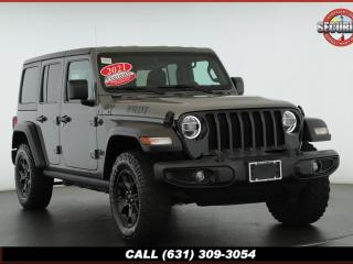 Certified 2021 Jeep Wrangler Unlimited Willysone owner, clean Carfax, and pure off-road beast! Classic rugged style meets modern tech, ready to conquer trails or cruise city streets. Open-air freedom and legendary capabilityyour next adventure starts here! Every Westbury Pre-owned vehicle is thoroughly checked and reconditioned. All this vehicle needs is you!BUY WITH CONFIDENCE7-Year/100,000-Mile Powertrain Limited warranty, Rental Car Allowance, 24-Hour Towing and Roadside Assistance, Carfax Vehicle History Report, 3-Month/3,000-Mile Maximum Care Coverage, Introductory 3-month subscription to SiriusXM Satellite RadioOPTION PACKAGESQUICK ORDER PACKAGE 25W WILLYS Engine: 3.6L V6 24V VVT eTorque UPG I, Transmission: 8-Speed Automatic (850RE), Willys, Mold In Color Bumper w/Gloss Black, Speed Sensitive Power Locks, Automatic Headlamps, Leather Wrapped Steering Wheel, Black Trail Rated Badge, 4-Wheel Drive Swing Gate Decal, Black Grille, MOPAR All-Weather Floor Mats (DISC), Willys Hood Decal, Rock Protection Sill Rails, Front 1-Touch Down Power Windows, Power Heated Mirrors, Wrangler Decal, Matte Black Jeep Badge, Security Alarm, Remote Keyless Entry, Sun Visors w/Illuminated Vanity Mirrors, Front LED Fog Lamps, LED Premium Reflector Headlamps, DUAL TOP GROUP Premium Black Sunrider Soft Top w/Dual Top Group, Black 3-Piece Hard Top, Freedom Panel Storage Bag, Rear Window Defroster, Rear Window Wiper/WasherWHY BUY FROM USWe hand select the finest automobiles possible, recondition as required so you do not have to worry about anything shortly down the road. Our Certified vehicles for example all have more than 50% brake life, most have brand new brakes installed front and rear and it does not end there.WESTBURY VIPAmerica's #1 VIP Plus Program includes Complimentary Loaner Cars, UnlimitedOil & Filter changes for 1 yr. & then included with every factorymaintenance, Courtesy Shuttle to work, home or any other location, ExpressLube 30 minutes or less w/ no appointment necessary, Complimentary NYSI, 24/7 Rescue & Towing.