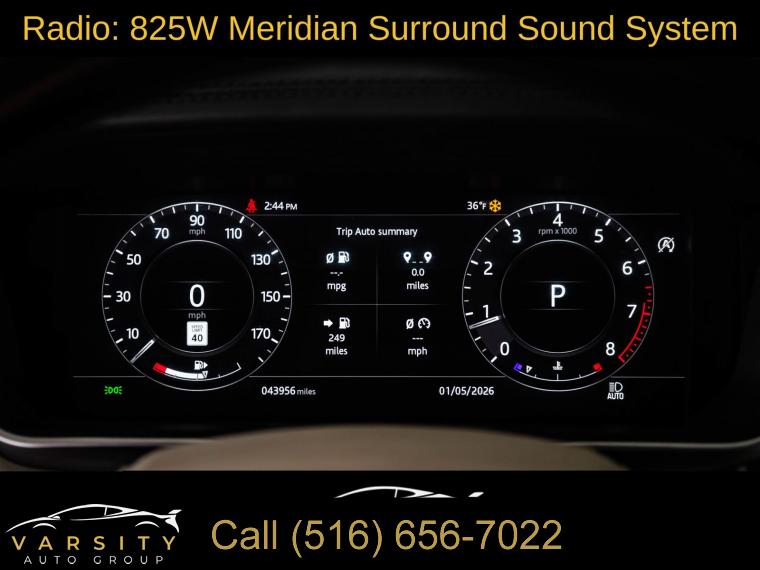 Navigation system: InControl Navigation Pro, 19 Speakers, AM/FM radio: SiriusXM, Premium audio system: Meridian, Radio data system, Radio: 825W Meridian Surround Sound System, Weather band radio, Air Conditioning, Automatic temperature control, Front dual zone A/C, Rear air conditioning, Rear dual zone A/C, Rear window defroster, Head restraints memory, Heads-Up Display, Memory seat, Power driver seat, Power steering, Power windows, Remote keyless entry, Steering wheel memory, Steering wheel mounted A/C controls, Steering wheel mounted audio controls, Adaptive suspension, Auto-leveling suspension, Four wheel independent suspension, Speed-sensing steering, Traction control, 4-Wheel Disc Brakes, ABS brakes, Anti-whiplash front head restraints, Dual front impact airbags, Dual front side impact airbags, Emergency communication system: InControl Protect, Front anti-roll bar, Low tire pressure warning, Occupant sensing airbag, Overhead airbag, Power adjustable front head restraints, Rear anti-roll bar, Power moonroof, Blind Spot Assist, Brake assist, Electronic Stability Control, Exterior Parking Camera Rear, Auto High-beam Headlights, Delay-off headlights, Front fog lights, Fully automatic headlights, Headlight cleaning, Rear fog lights, Panic alarm, Security system, Speed control, Auto-dimming door mirrors, Bumpers: body-color, Door auto-latch, Heated door mirrors, Power door mirrors, Turn signal indicator mirrors, 20-Way Htd/Cooled Front Bucket Seats, 360 Parking Aid, Apple CarPlay & Android Auto, Auto tilt-away steering wheel, Auto-dimming Rear-View mirror, Clear Exit Monitor, Compass, Driver Condition Monitor, Driver door bin, Driver vanity mirror, Front reading lights, Garage door transmitter: HomeLink, Genuine wood console insert, Genuine wood dashboard insert, Genuine wood door panel insert, Heated steering wheel, High-Speed Emergency Braking, Illuminated entry, Outside temperature display, Overhead console, Passenger seat mounted armrest, Passenger vanity mirror, Rear reading lights, Rear seat center armrest, Rear Traffic Monitor, Tachometer, Telescoping steering wheel, Tilt steering wheel, Traffic Sign Recognition & Adaptive Speed Limiter, Trip computer, Driver's Seat Mounted Armrest, Front Bucket Seats, Heated front seats, Heated rear seats, Perforated Windsor Leather Seat Trim, Power passenger seat, Split folding rear seat, Ventilated front seats, Front Center Armrest w/Storage, Passenger door bin, Alloy wheels, Wheels: 21" 7 Split-Spoke Gloss Silver, Rain sensing wipers, Rear window wiper, Speed-Sensitive Wipers, Variably intermittent wipers, 3.31 Axle Ratio, The Price you See, is the Price You Pay!!!, 2021 Land Rover Range Rover Westminster, Flux Silver, Almond/Espresso/Almond/Ivory w/Perforated Semi-Aniline Leather Seat Trim, Clean CARFAX