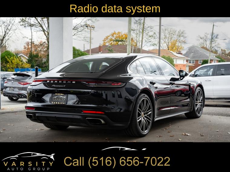 10 Speakers, 4-Wheel Disc Brakes, 8-Way Power Seats, ABS brakes, Adaptive suspension, Air Conditioning, Alloy wheels, AM/FM radio: SiriusXM, Apple CarPlay, Auto-dimming door mirrors, Auto-dimming Rear-View mirror, Automatic temperature control, Brake assist, Compass, Delay-off headlights, Driver door bin, Driver vanity mirror, Dual front impact airbags, Dual front side impact airbags, Electronic Stability Control, Exterior Parking Camera Rear, Four wheel independent suspension, Front anti-roll bar, Front Bucket Seats, Front Center Armrest, Front dual zone A/C, Front reading lights, Fully automatic headlights, Garage door transmitter: HomeLink, Heated door mirrors, Heated front seats, Illuminated entry, Knee airbag, Leather Shift Knob, Leather steering wheel, Low tire pressure warning, Memory seat, Navigation System, Occupant sensing airbag, Outside temperature display, Overhead airbag, Overhead console, Panic alarm, Partial Leather Seat Trim, Passenger door bin, Passenger vanity mirror, Porsche Communication Management, Power door mirrors, Power driver seat, Power Liftgate, Power moonroof, Power passenger seat, Power steering, Power windows, Radio data system, Rain sensing wipers, Rear anti-roll bar, Rear fog lights, Rear reading lights, Rear seat center armrest, Rear side impact airbag, Rear window defroster, Remote keyless entry, Security system, Speed control, Split folding rear seat, Spoiler, Steering wheel mounted audio controls, Tachometer, Telescoping steering wheel, Tilt steering wheel, Traction control, Trip computer, Variably intermittent wipers, Wheels: 19" Panamera. Black 2021 Porsche Panamera 4 8-Speed Porsche Doppelkupplung (PDK) V6