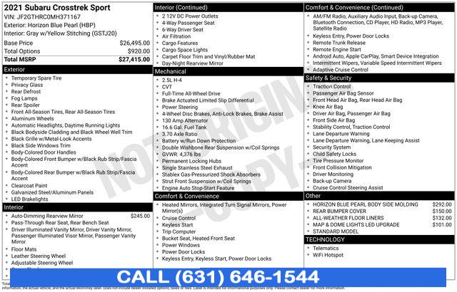 For more information on this 2021 Subaru Crosstrek, please call Stream Auto Outlet Islip at (631) 646-1544 or with the contact form on this page. This vehicle's vin number is JF2GTHRC0MH371167 and is recorded as being in stock at Stream Auto Outlet Islip at 2232 Sunrise Hwy in Islip. See all cars from this dealership.