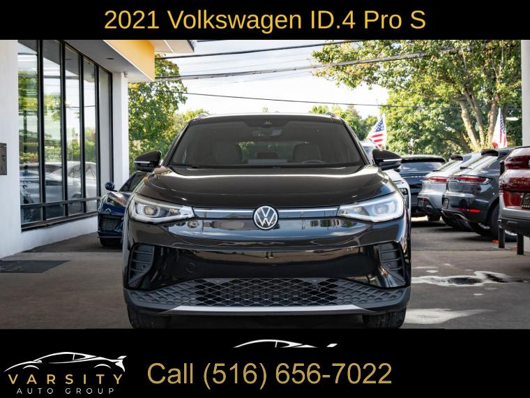 Navigation System, Gradient Package, Black Roof, 7 Speakers, Radio data system, Radio: Discover Pro Max w/12" Touchscreen Nav, Air Conditioning, Automatic temperature control, Front dual zone A/C, Rear window defroster, Memory seat, Power driver seat, Power steering, Power windows, Remote keyless entry, Steering wheel mounted audio controls, Four wheel independent suspension, Speed-sensing steering, Traction control, ABS brakes, Dual front impact airbags, Dual front side impact airbags, Emergency communication system: VW Car-Net services (capabilities require enrollment or subscription), Front anti-roll bar, Low tire pressure warning, Occupant sensing airbag, Overhead airbag, Rear anti-roll bar, Silver Accents on Front & Rear Bumpers, Power Liftgate, Brake assist, Electronic Stability Control, Exterior Parking Camera Rear, Auto High-beam Headlights, Delay-off headlights, Front fog lights, Fully automatic headlights, Panic alarm, Speed control, 4 Wheel Independent Suspension, Bumpers: body-color, Heated door mirrors, Power door mirrors, Roof rack: rails only, Spoiler, Turn signal indicator mirrors, Auto-dimming Rear-View mirror, Driver door bin, Driver vanity mirror, EV Roadside Assistance Kit, Frameless Auto-Dimming Rearview Mirror w/HomeLink, Front reading lights, Heated steering wheel, Illuminated entry, Outside temperature display, Overhead console, Passenger seat mounted armrest, Passenger vanity mirror, Rear reading lights, Rear seat center armrest, Telescoping steering wheel, Tilt steering wheel, Trip computer, Driver's Seat Mounted Armrest, Front Bucket Seats, Heated Front Seats, Heated front seats, Perforated V-Tex Leatherette Seating Surfaces, Power passenger seat, Split folding rear seat, Passenger door bin, Alloy wheels, Wheels: 19" 5-Spoke 2-Tone Machined Alloy, Wheels: 20" Dynamic Design Machined Alloy, Rain sensing wipers, Rear window wiper, Variably intermittent wipers, 4.39 Axle Ratio, 2021 Volkswagen ID.4 Pro S, Mythos Black Metallic, Galaxy Black w/Perforated V-Tex Leatherette Seating Surfaces, 1 Owner, Clean CARFAX