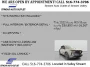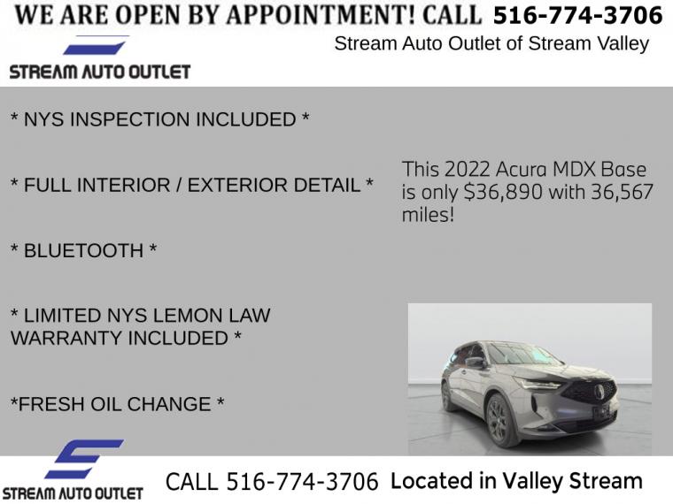 For more information on this 2022 Acura MDX, please call Stream Auto Outlet Valley Stream at (516) 774-3706 or with the contact form on this page. This vehicle's vin number is 5J8YE1H03NL802788 and is recorded as being in stock at Stream Auto Outlet Valley Stream at 324 W Merrick Rd in Valley Stream. See all cars from this dealership.