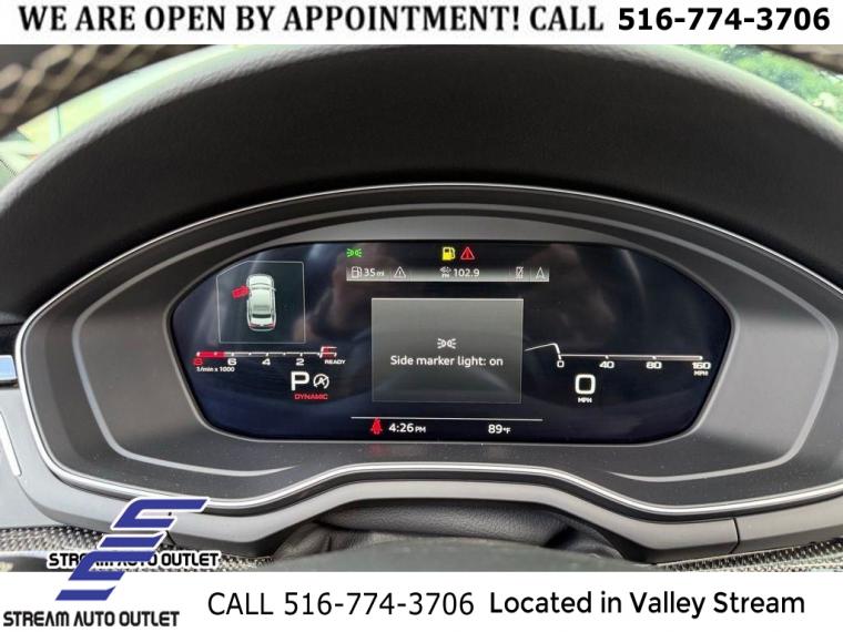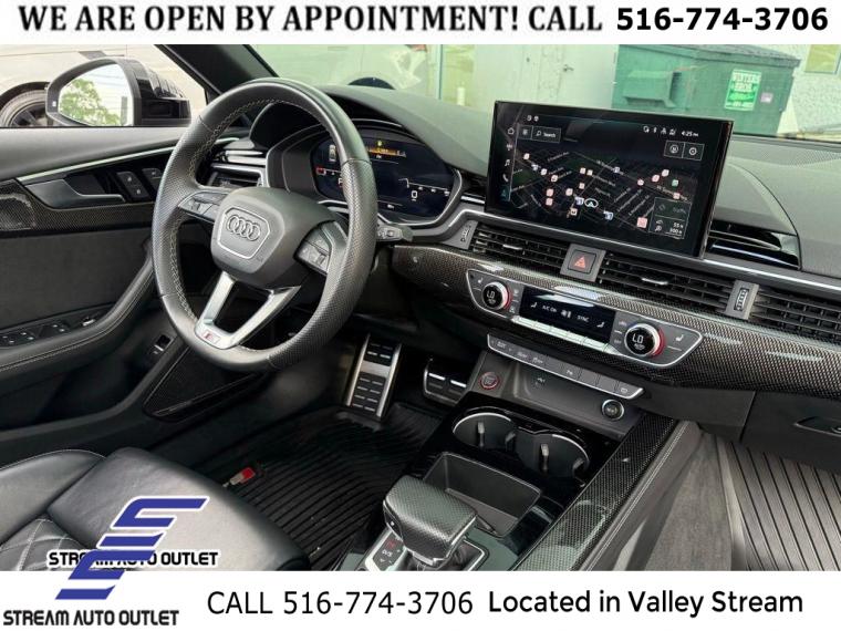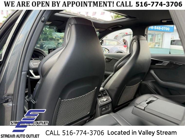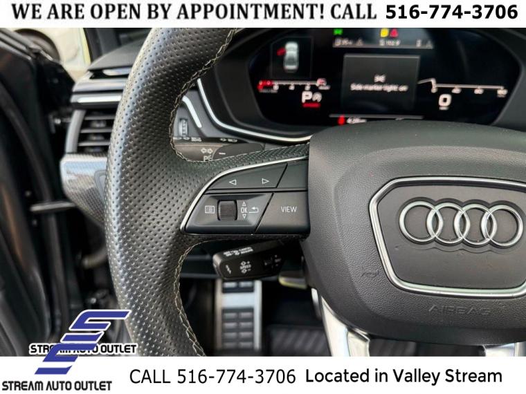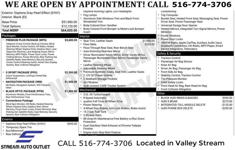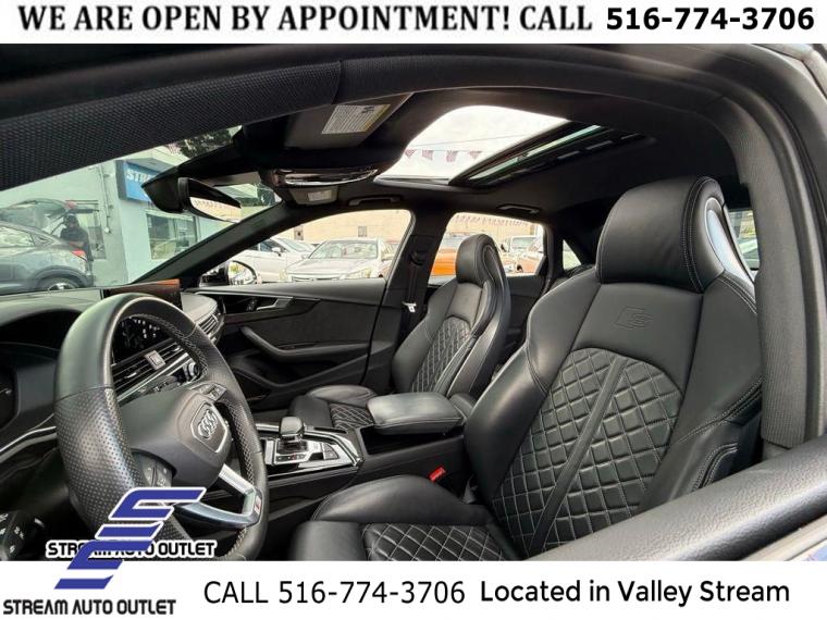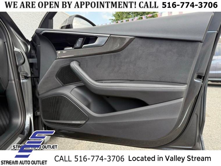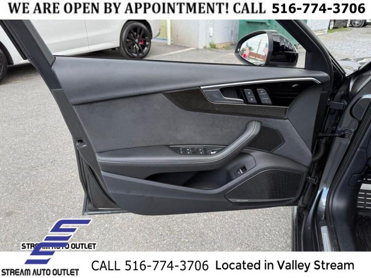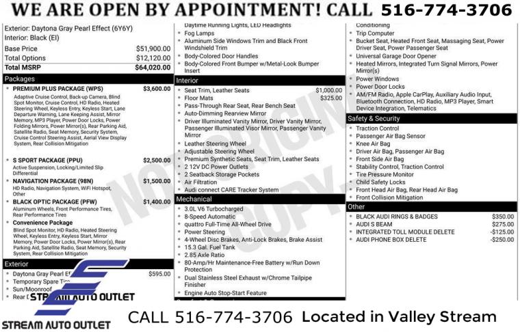 Black Optic Package, Convenience Package, Navigation Package, Premium Plus Package, S Sport Package, 10 Speakers, AM/FM radio, Audi Connect PRIME & PLUS Online Services, Bang & Olufsen Sound System w/3D Sound, Radio data system, Radio: MMI w/Audi Sound System, SiriusXM All Access Service, Air Conditioning, Automatic temperature control, Front dual zone A/C, Rear air conditioning, Rear window defroster, Audi Advanced Key, Driver's Seat Memory, Power driver seat, Power steering, Power windows, Remote keyless entry, Steering wheel mounted audio controls, Four wheel independent suspension, Speed-sensing steering, Sport Rear Differential, Traction control, 4-Wheel Disc Brakes, ABS brakes, Dual front impact airbags, Dual front side impact airbags, Emergency communication system: Audi connect CARE, Front anti-roll bar, Knee airbag, Low tire pressure warning, Occupant sensing airbag, Overhead airbag, Rear anti-roll bar, Red Brake Calipers, Power moonroof, Brake assist, Electronic Stability Control, Exterior Parking Camera Rear, Auto High-beam Headlights, Delay-off headlights, Front fog lights, Alarm System w/Motion Sensors, Panic alarm, Adaptive Cruise Control w/Traffic Jam Assist, Hands-On Detection Steering Wheel, Speed control, Auto-Dimming Exterior Mirrors w/Memory, Black Audi Rings & Badges, Black Exterior Mirror Housings, Black Exterior Trim, Body Color Side Sill Blades, Bumpers: body-color, Heated door mirrors, Power door mirrors, Power Folding Exterior Mirrors, Spoiler, Sport Adaptive Damping Suspension, Turn signal indicator mirrors, 2 Rear USB Charging Ports, All-Weather Floor Mats, Audi Active Lane Assist, Audi Phone Box, Audi Phone Box Delete, Audi S Beam, Audi Side Assist w/Pre Sense Rear, Audi smartphone interface (Apple CarPlay/Android Auto), Audi Virtual Cockpit Plus, Auto-dimming Rear-View mirror, Cargo Mat, Compass, Driver door bin, Driver vanity mirror, Front reading lights, Garage door transmitter: HomeLink, Heated Front S Sport Seats, Heated Steering Wheel, Illuminated entry, Integrated Toll Module Delete, Leather Shift Knob, Leather steering wheel, Leatherette Covered Center Console & Door Armrests, MMI Navigation Plus, Outside temperature display, Overhead console, Parking System Plus (Front/Rear Acoustic Sensors), Passenger vanity mirror, Rear reading lights, Rear seat center armrest, Sport steering wheel, Tachometer, Telescoping steering wheel, Tilt steering wheel, Top View Camera System, Trip computer, Front Bucket Seats, Front Center Armrest, Heated front seats, Leather/Dinamica Seating Surfaces, Power passenger seat, Split folding rear seat, Passenger door bin, Alloy wheels, Wheels: 18" 5-Y-Spoke Design, Wheels: 19" 5-V-Spoke-Star Design, Rain sensing wipers, Speed-Sensitive Wipers, Variably intermittent wipers, * NYS INSPECTION INCLUDED *, * FULL INTERIOR / EXTERIOR DETAIL *, * BACK UP CAMERA *, * NAVIGATION SYSTEM *, * BLUETOOTH *, * LIMITED NYS LEMON LAW WARRANTY INCLUDED *, *FRESH OIL CHANGE *, * 150 MULTI POINT INSPECTION *