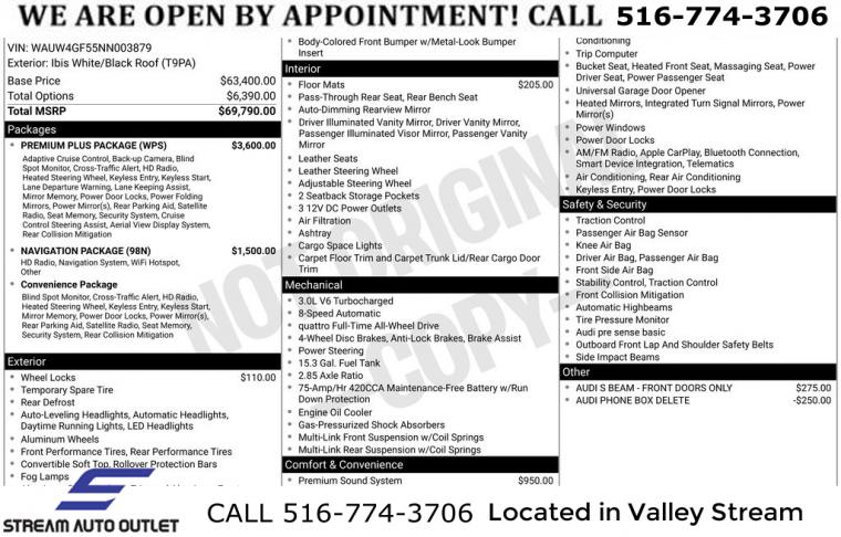 • Convenience Package, Navigation Package, Premium Plus Package, 10 Speakers, AM/FM radio, Audi Connect PRIME & PLUS, Bang & Olufsen Sound System w/3D Sound, Radio data system, Radio: Audi Sound System, Air Conditioning, Automatic temperature control, Front dual zone A/C, Rear air conditioning, Rear window defroster, Power driver seat, Power steering, Power windows, Remote keyless entry, Steering wheel mounted audio controls, Four wheel independent suspension, Speed-sensing steering, Traction control, 4-Wheel Disc Brakes, ABS brakes, Dual front impact airbags, Dual front side impact airbags, Emergency communication system: Audi connect CARE, Front anti-roll bar, Integrated roll-over protection, Knee airbag, Low tire pressure warning, Occupant sensing airbag, Rear anti-roll bar, Brake assist, Electronic Stability Control, Exterior Parking Camera Rear, Auto High-beam Headlights, Delay-off headlights, Front fog lights, Panic alarm, Audi Adaptive Cruise Control w/Traffic Jam Assist, Hands-On Detection Steering Wheel, Speed control, Bumpers: body-color, Convertible roof wind blocker, Heated door mirrors, Power door mirrors, Power Folding Exterior Mirrors, Turn signal indicator mirrors, Audi Active Lane Assist, Audi Phone Box, Audi Virtual Cockpit Plus, Auto-dimming Rear-View mirror, Compass, Convertible roof lining, Driver door bin, Driver vanity mirror, Front reading lights, Garage door transmitter: HomeLink, Heated Front S Sport Seats, Illuminated entry, Leather Shift Knob, Leather steering wheel, Leatherette Covered Center Console & Door Armrests, MMI Navigation Plus, Outside temperature display, Passenger vanity mirror, Power convertible roof, Rear reading lights, Tachometer, Telescoping steering wheel, Tilt steering wheel, Top View Camera System, Trip computer, Fine Nappa Leather Seating Surfaces, Front Bucket Seats, Front Center Armrest, Heated front seats, Power passenger seat, Split folding rear seat, Passenger door bin, Alloy wheels, Wheels: 19" 5-Double-Arm Design Bi-Color Finish, Glass rear window, Rain sensing wipers, Speed-Sensitive Wipers, Variably intermittent wipers, * NYS INSPECTION INCLUDED *, * FULL INTERIOR / EXTERIOR DETAIL *, * BLUETOOTH *, * LIMITED NYS LEMON LAW WARRANTY INCLUDED *, *FRESH OIL CHANGE *, * 150 MULTI POINT INSPECTION *