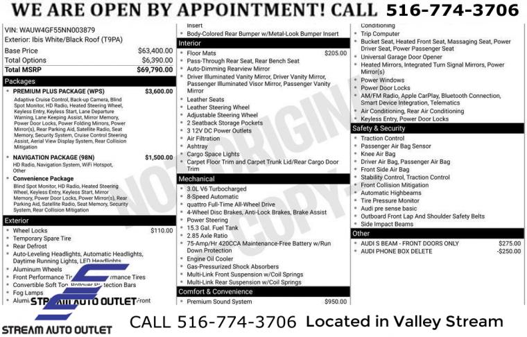 For more information on this 2022 Audi S5, please call Stream Auto Outlet Valley Stream at (516) 774-3706 or with the contact form on this page. This vehicle's vin number is WAUW4GF55NN003879 and is recorded as being in stock at Stream Auto Outlet Valley Stream at 324 W Merrick Rd in Valley Stream. See all cars from this dealership.