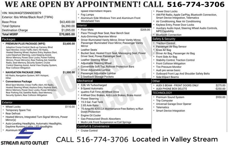 Navigation System, Convenience Package, Navigation Package, Premium Plus Package, 10 Speakers, AM/FM radio, Audi Connect PRIME & PLUS, Bang & Olufsen Sound System w/3D Sound, Radio data system, Radio: Audi Sound System, Air Conditioning, Automatic temperature control, Front dual zone A/C, Rear air conditioning, Rear window defroster, Power driver seat, Power steering, Power windows, Remote keyless entry, Steering wheel mounted audio controls, Four wheel independent suspension, Speed-sensing steering, Traction control, 4-Wheel Disc Brakes, ABS brakes, Dual front impact airbags, Dual front side impact airbags, Emergency communication system: Audi connect CARE, Front anti-roll bar, Integrated roll-over protection, Knee airbag, Low tire pressure warning, Occupant sensing airbag, Rear anti-roll bar, Brake assist, Electronic Stability Control, Exterior Parking Camera Rear, Auto High-beam Headlights, Delay-off headlights, Front fog lights, Panic alarm, Audi Adaptive Cruise Control w/Traffic Jam Assist, Hands-On Detection Steering Wheel, Speed control, Bumpers: body-color, Convertible roof wind blocker, Heated door mirrors, Power door mirrors, Power Folding Exterior Mirrors, Turn signal indicator mirrors, Audi Active Lane Assist, Audi Phone Box, Audi S Beam - Front Doors Only, Audi Virtual Cockpit Plus, Auto-dimming Rear-View mirror, Compass, Convertible roof lining, Driver door bin, Driver vanity mirror, Front reading lights, Garage door transmitter: HomeLink, Heated Front S Sport Seats, Illuminated entry, Leather Shift Knob, Leather steering wheel, Leatherette Covered Center Console & Door Armrests, MMI Navigation Plus, Outside temperature display, Passenger vanity mirror, Power convertible roof, Rear reading lights, Tachometer, Telescoping steering wheel, Tilt steering wheel, Top View Camera System, Trip computer, Fine Nappa Leather Seating Surfaces, Front Bucket Seats, Front Center Armrest, Heated front seats, Power passenger seat, Split folding rear seat, Passenger door bin, Alloy wheels, Wheels: 19" 5-Double-Arm Design Bi-Color Finish, Glass rear window, Rain sensing wipers, Speed-Sensitive Wipers, Variably intermittent wipers, * NYS INSPECTION INCLUDED *, * FULL INTERIOR / EXTERIOR DETAIL *, * BACK UP CAMERA *, * NAVIGATION SYSTEM *, * BLUETOOTH *, * LEATHER SEATS *, * LIMITED NYS LEMON LAW WARRANTY INCLUDED *, *FRESH OIL CHANGE *, * 150 MULTI POINT INSPECTION *, APPLE CAR PLAY/ANDROID AUTO