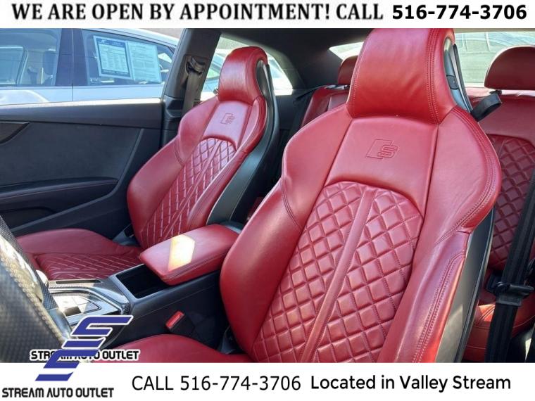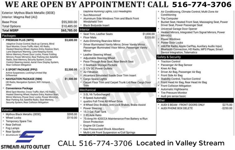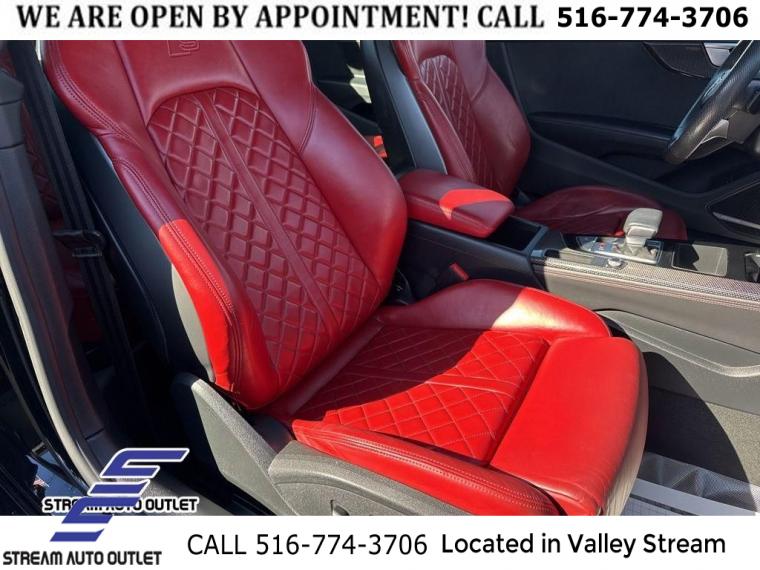 Convenience Package, Navigation Package, Premium Plus, S Sport Package, 10 Speakers, AM/FM radio, Bang & Olufsen Sound System w/3D Sound, Radio data system, Radio: Audi Sound System, SiriusXM All Access Service, Air Conditioning, Automatic temperature control, Front dual zone A/C, Rear air conditioning, Rear window defroster, Audi Advanced Key, Driver Seat Memory, Power driver seat, Power steering, Power windows, Remote keyless entry, Steering wheel mounted audio controls, Four wheel independent suspension, Speed-sensing steering, Sport Rear Differential, Traction control, 4-Wheel Disc Brakes, ABS brakes, Dual front impact airbags, Dual front side impact airbags, Emergency communication system: Audi connect CARE, Front & Rear Red Brake Calipers, Front anti-roll bar, Knee airbag, Low tire pressure warning, Occupant sensing airbag, Overhead airbag, Rear anti-roll bar, Power moonroof, Brake assist, Electronic Stability Control, Exterior Parking Camera Rear, Auto High-beam Headlights, Delay-off headlights, Front fog lights, Alarm System w/Motion Sensors, Panic alarm, Adaptive Cruise Control w/Traffic Jam Assist, Hands-On Detection Steering Wheel, Speed control, Auto-Dimming Exterior Mirrors, Bumpers: body-color, Heated door mirrors, Power door mirrors, Power Folding Exterior Mirrors, Spoiler, Sport Adaptive Damping Suspension, Turn signal indicator mirrors, Audi Active Lane Assist, Audi Guard All-Weather Mats, Audi Phone Box, Audi Phone Box Delete, Audi S Beam - Front Doors Only, Audi Side Assist w/Pre Sense Rear, Audi Virtual Cockpit Plus, Auto-dimming Rear-View mirror, Compass, Driver door bin, Driver vanity mirror, Front reading lights, Garage door transmitter: HomeLink, Heated Front S Sport Seats, Heated Steering Wheel, Illuminated entry, Leather Shift Knob, Leather steering wheel, Leatherette Covered Center Console & Door Armrests, MMI Navigation Plus, Outside temperature display, Overhead console, Parking System Plus (Front/Rear Acoustic Sensors), Passenger vanity mirror, Rear reading lights, Rear seat center armrest, Tachometer, Telescoping steering wheel, Tilt steering wheel, Top View Camera System, Trip computer, Front Bucket Seats, Front Center Armrest, Heated front seats, Leather/Dinamica Seating Surfaces, Power passenger seat, Split folding rear seat, Passenger door bin, Alloy wheels, Audi Guard Wheel Lock Kit, Wheels: 19" 5-Double-Arm Design Bi-Color Finish, Rain sensing wipers, Speed-Sensitive Wipers, Variably intermittent wipers, * NYS INSPECTION INCLUDED *, * FULL INTERIOR / EXTERIOR DETAIL *, * BLUETOOTH *, * LIMITED NYS LEMON LAW WARRANTY INCLUDED *, *FRESH OIL CHANGE *, * 150 MULTI POINT INSPECTION *