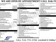 BEGIN THE SIMPLE PROCESS. PERSONALIZE THE PAYMENTS THAT FIT YOUR BUDGET, ADD YOUR TRADE-IN INFORMATION, APPLY FOR YOUR AUTO LOAN, SCHEDULE A PICKUP OR DELIVERY DATE. (HOME DELIVERY AVAILABLE*). EVERY VEHICLE HAS BEEN PRICED BELOW COST IN ORDER TO TURN INVENTORY QUICKLY AND PASS ON THE SAVINGS TO YOU! EACH VEHICLE COMES WITH A FREE LIMITED POWERTRAIN WARRANTY AND FREE CARFAX REPORT! WITH THESE SAVINGS THESE VEHICLES WONT LAST. CALL TO GET YOUR GREAT DEAL TODAY! (516) 774-3706.