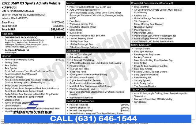 For more information on this 2022 BMW X3, please call Stream Auto Outlet Islip at (631) 646-1544 or with the contact form on this page. This vehicle's vin number is 5UX53DP09N9M26247 and is recorded as being in stock at Stream Auto Outlet Islip at 2232 Sunrise Hwy in Islip. See all cars from this dealership.