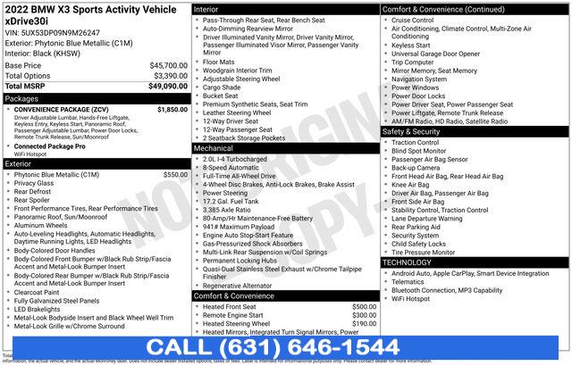 2022 BMW X3 xDrive30i Phytonic Blue Metallic 8-Speed Automatic Sport 8-Speed Automatic Sport, Connected Package Pro, Convenience Package, Lumbar Support, Panoramic Moonroof. CARFAX One-Owner. 21/28 City/Highway MPG