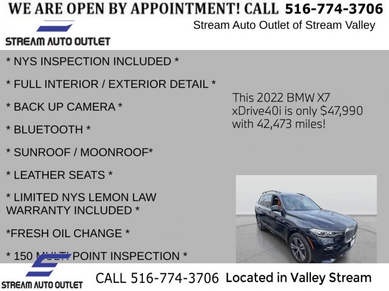 For more information on this 2022 BMW X7, please call Stream Auto Outlet Valley Stream at (516) 774-3706 or with the contact form on this page. This vehicle's vin number is 5UXCW2C09N9L41305 and is recorded as being in stock at Stream Auto Outlet Valley Stream at 324 W Merrick Rd in Valley Stream. See all cars from this dealership.