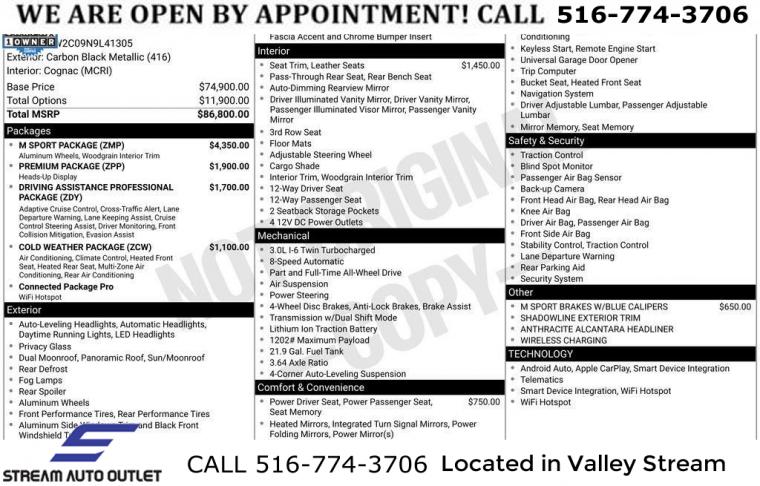 Navigation System, Cold Weather Package, Connected Package Pro, Driving Assistance Professional Package, M Sport Package, M Sport Package (337), Premium Package, 10 Speakers, AM/FM radio: SiriusXM with 360L, AM/FM Stereo, Hi-Fi Sound System, Radio data system, SiriusXM w/360L, Wireless Charging, 5-Zone Automatic Climate Control, Air Conditioning, Automatic temperature control, Front dual zone A/C, Rear air conditioning, Rear dual zone A/C, Rear window defroster, Head restraints memory, Head-Up Display, Lumbar Support, Memory seat, Power driver seat, Power steering, Power windows, Remote keyless entry, Steering wheel memory, Steering wheel mounted audio controls, Auto-leveling suspension, Four wheel independent suspension, Speed-sensing steering, Traction control, 4-Wheel Disc Brakes, ABS brakes, Dual front impact airbags, Dual front side impact airbags, Emergency communication system: BMW Assist eCall, Front anti-roll bar, Knee airbag, Low tire pressure warning, M Sport Brakes w/Blue Calipers, Occupant sensing airbag, Overhead airbag, Power adjustable front head restraints, Rear anti-roll bar, Power moonroof: Panorama, Soft-Close Automatic Doors, Brake assist, Electronic Stability Control, Exterior Parking Camera Rear, Auto High-beam Headlights, Delay-off headlights, Front fog lights, Fully automatic headlights, Panic alarm, Security system, Extended Traffic Jam Assistant, Speed control, Aerodynamic Kit, Auto-dimming door mirrors, Bumpers: body-color, Heated door mirrors, Power door mirrors, Roof rack: rails only, Shadowline Exterior Trim, Spoiler, Turn signal indicator mirrors, Without Lines Designation Outside, Active Driving Assistant Pro, Anthracite Alcantara Headliner, Apple CarPlay & Android Auto Compatibility, Apple CarPlay Compatibility, Auto tilt-away steering wheel, Auto-dimming Rear-View mirror, BMW Assist eCall, BMW TeleServices, Compass, ConnectedDrive Services, Driver door bin, Driver vanity mirror, Front reading lights, Garage door transmitter, Genuine wood console insert, Genuine wood dashboard insert, Genuine wood door panel insert, Gesture Control, Heated steering wheel, Illuminated entry, Leather Shift Knob, Live Cockpit Pro w/Navi, M Steering Wheel, Outside temperature display, Passenger vanity mirror, Rear reading lights, Rear seat center armrest, Sport steering wheel, Tachometer, Telescoping steering wheel, Tilt steering wheel, Trip computer, WiFi Hotspot, 3rd row seats: split-bench, Front & Rear Heated Seats, Front Bucket Seats, Front Center Armrest, Heated front seats, Heated Sport Seats, Multi-Contour Seats, Power Front Seats, Power passenger seat, Reclining 3rd row seat, SensaTec Upholstery, Split folding rear seat, Vernasca Leather Upholstery, High-Gloss Shadowline Roof Rails, Passenger door bin, Alloy wheels, Wheels: 21" x 9.5" Double-Spoke Bi-Color Orbit Grey, Wheels: 21" x 9.5" Y-Spoke Bi-Color, Rear Electric Side Window Shades, Rain sensing wipers, Rear window wiper, Speed-Sensitive Wipers, Variably intermittent wipers, 3.64 Axle Ratio, * NYS INSPECTION INCLUDED *, * FULL INTERIOR / EXTERIOR DETAIL *, * BACK UP CAMERA *, * BLUETOOTH *, * SUNROOF / MOONROOF*, * LEATHER SEATS *, * LIMITED NYS LEMON LAW WARRANTY INCLUDED *, *FRESH OIL CHANGE *, * 150 MULTI POINT INSPECTION *