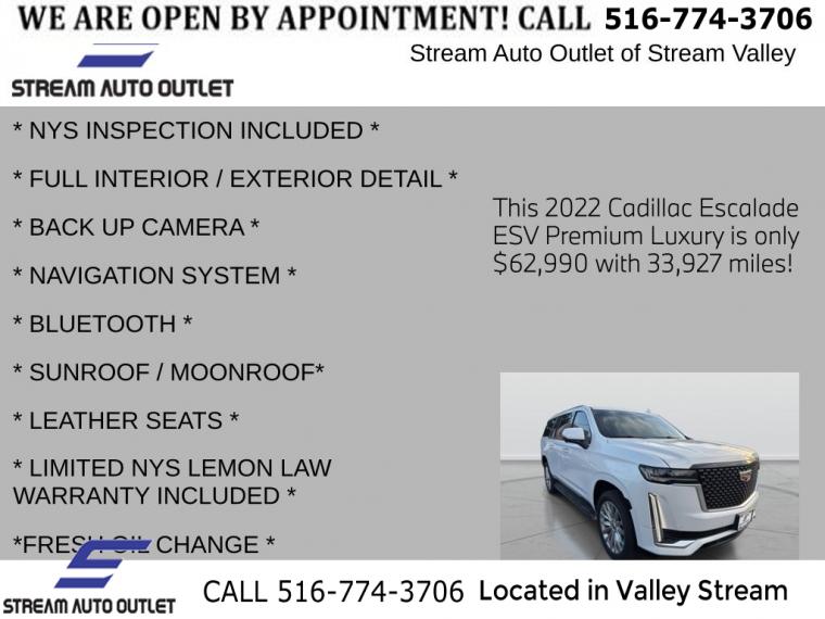 For more information on this 2022 Cadillac Escalade ESV, please call Stream Auto Outlet Valley Stream at (516) 774-3706 or with the contact form on this page. This vehicle's vin number is 1GYS4KKL6NR130457 and is recorded as being in stock at Stream Auto Outlet Valley Stream at 324 W Merrick Rd in Valley Stream. See all cars from this dealership.