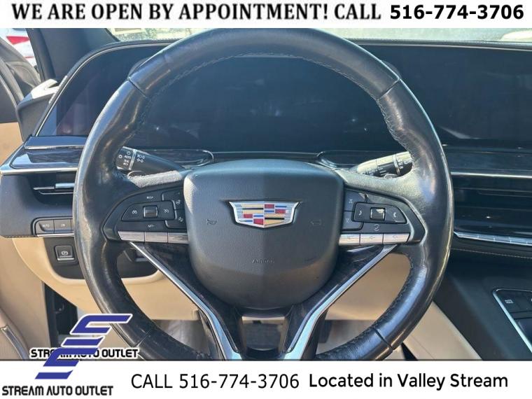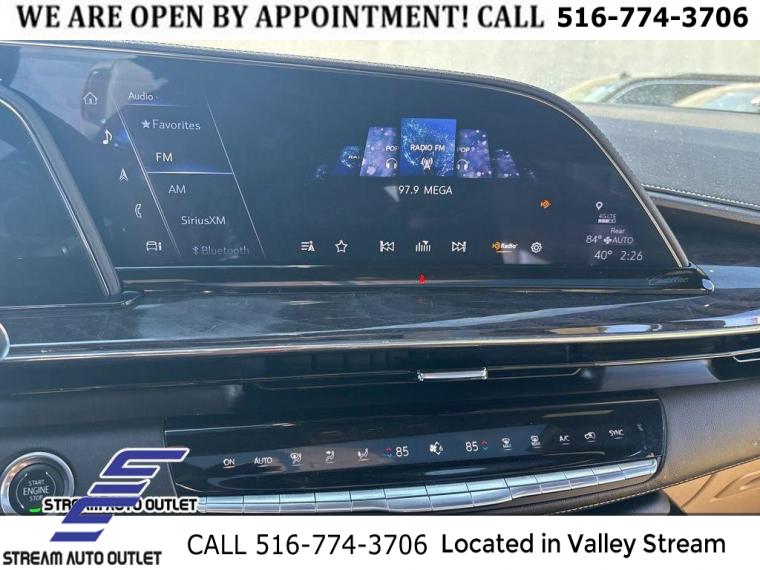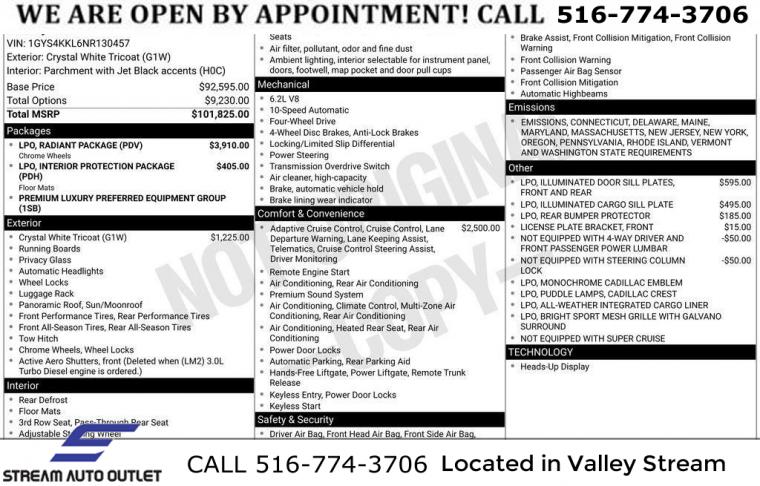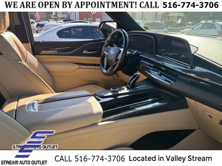 Navigation System, Interior Protection Package (LPO), Preferred Equipment Group 1SB, Radiant Package (LPO) (DISC), 19 Speakers, AKG Studio 19-Speaker Audio System, AM/FM radio: SiriusXM with 360L, Audio memory, HD Radio, Radio data system, Radio: AM/FM/SiriusXM w/Navigation, SiriusXM w/360L, Air Conditioning, Automatic temperature control, Front dual zone A/C, Rear air conditioning, Rear window defroster, 8-Way Power Driver Seat Adjuster, 8-Way Power Front Passenger Seat Adjuster, Heads-Up Display, Memory seat, Power driver seat, Power steering, Power windows, Remote keyless entry, Steering wheel memory, Steering wheel mounted audio controls, Four wheel independent suspension, Mechanical Limited-Slip Differential, Premium Smooth Ride Suspension, Traction control, 4-Wheel Disc Brakes, ABS brakes, Door Lock & Latch Shields, Dual front impact airbags, Dual front side impact airbags, Emergency communication system: OnStar and Cadillac connected services capable, Front anti-roll bar, Low tire pressure warning, Occupant sensing airbag, Overhead airbag, Rear anti-roll bar, Power moonroof, Power Panoramic Tilt-Sliding Sunroof, Power Liftgate, Brake assist, Electronic Stability Control, Auto High-beam Headlights, Delay-off headlights, Fully automatic headlights, Automatic Seat Belt Tightening, Panic alarm, Security system, Theft-Deterrent Alarm System, Adaptive Cruise Control, Not Equipped w/Super Cruise, Speed control, Super Cruise, Automatic Stop/Start, Start/Stop System Disable Button, Auto-dimming door mirrors, Bright Sport Mesh Grille (LPO), Bumpers: body-color, Front License Plate Bracket, Heated door mirrors, Monochrome Cadillac Emblems (LPO), Power door mirrors, Puddle Lamps w/Cadillac Crest (LPO), Rear Bumper Protector, Rear Camera Mirror Washer, Roof rack: rails only, Running Board Assist Steps, Spoiler, Turn signal indicator mirrors, 16.9" Diagonal OLED Infotainment Screen, 1st 2nd & 3rd Row All-Weather Floor Mats (LPO), All-Weather Integrated Cargo Liner (LPO), Apple CarPlay/Android Auto, Auto tilt-away steering wheel, Compass, Driver door bin, Driver vanity mirror, Enhanced Automatic Emergency Braking, Enhanced Automatic Parking Assist, Front reading lights, Garage door transmitter, Glass Breakage Sensor, Heated steering wheel, Illuminated Cargo Sill Plate (LPO), Illuminated entry, Illuminated Front Door Sill Plates (LPO), Lane Change Alert w/Side Blind Zone Alert, Leather steering wheel, Not Equipped w/Steering Column Lock, Outside temperature display, Overhead console, Passenger vanity mirror, Rear Camera Mirror, Rear Cross Traffic Alert, Rear reading lights, Reconfigurable Full-Color Head-Up Display, Reverse Automatic Braking, Tachometer, Teen Driver, Telescoping steering wheel, Tilt steering wheel, Trip computer, Vehicle Inclination Sensor, Vehicle Interior Movement Sensor, Voltmeter, Wireless Apple CarPlay/Wireless Android Auto, 2-Presets Memory For Driver Seat Adjuster, 2nd Row 60/40 Split-Folding Power Release Bench, 3rd row seats: split-bench, Front Bucket Seats, Heated & Ventilated Driver & Front Passenger Seats, Heated Driver & Front Passenger Seats, Heated front seats, Heated rear seats, Leather Seating Surfaces w/Mini-Chevron Perf Inserts, Not Equipped w/4-Way Driver & Fr Pass Pwr Lumbar, Power passenger seat, Split folding rear seat, Ventilated front seats, Front Center Armrest w/Storage, Passenger door bin, Alloy wheels, Wheels: 22" 12-Spoke Chrome Alloy (LPO), Wheels: 22" 14-Spoke Alloy w/Polished Finish, Wheels: 22" Interim (LPO), Rain sensing wipers, Rear window wiper, Variably intermittent wipers, 3.23 Axle Ratio, * NYS INSPECTION INCLUDED *, * FULL INTERIOR / EXTERIOR DETAIL *, * BACK UP CAMERA *, * NAVIGATION SYSTEM *, * BLUETOOTH *, * SUNROOF / MOONROOF*, * LEATHER SEATS *, * LIMITED NYS LEMON LAW WARRANTY INCLUDED *, *FRESH OIL CHANGE *, * 150 MULTI POINT INSPECTION *
