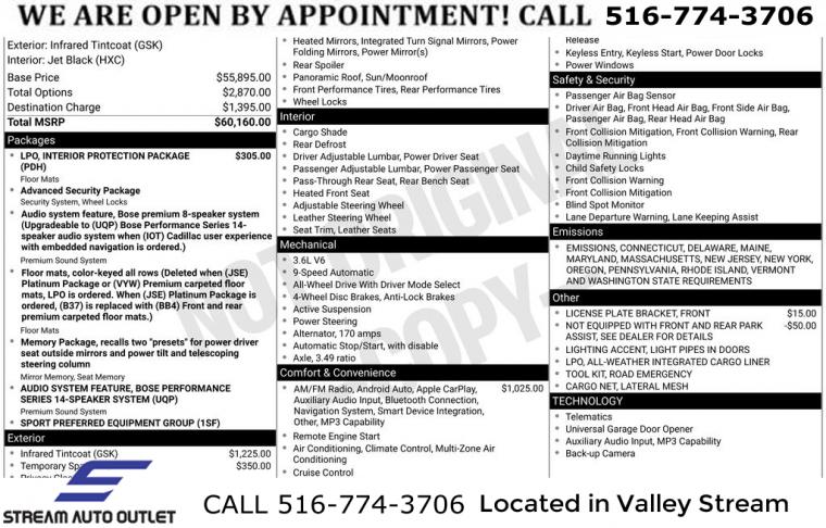 Interior Protection Package (LPO), Radio: Cadillac User Experience w/Embedded Nav, Sport Package 1SF, 8 Speakers, AM/FM radio: SiriusXM, Audio memory, Bose Performance Series 14 Speakers System, Bose Premium 8-Speaker Audio System Feature, Radio data system, Radio: Cadillac User Experience AM/FM Stereo, SiriusXM w/360L, Air Conditioning, Automatic Dual-Zone Climate Control, Automatic temperature control, Front dual zone A/C, Rear window defroster, Memory seat, Power driver seat, Power steering, Power windows, Remote keyless entry, Steering wheel memory, Steering wheel mounted audio controls, Adaptive suspension, Automatic Heated Steering Wheel, Four wheel independent suspension, Performance Suspension, Speed-sensing steering, Traction control, 4-Wheel Disc Brakes, ABS brakes, Dual front impact airbags, Dual front side impact airbags, Emergency communication system: OnStar and Cadillac connected services capable, Front anti-roll bar, Knee airbag, Low tire pressure warning, Occupant sensing airbag, Overhead airbag, Rear anti-roll bar, Power moonroof: UltraView, Power Liftgate, Brake assist, Electronic Stability Control, Front & Rear Park Assist, Auto High-beam Headlights, Delay-off headlights, Fully automatic headlights, Panic alarm, Road Emergency Tool Kit, Security system, Speed control, Automatic Stop/Start w/Disable, Auto-dimming door mirrors, Bodyside moldings, Bumpers: body-color, Front License Plate Bracket, Heated door mirrors, Power door mirrors, Spoiler, Turn signal indicator mirrors, All-Weather Floor Mats, All-Weather Integrated Cargo Liner (LPO), Apple CarPlay/Android Auto, Auto-dimming Rear-View mirror, Automatic Emergency Braking, Compass, Driver door bin, Driver vanity mirror, Dual Driver Info Center Display Gauge Cluster, Front reading lights, Garage door transmitter, HD Rear Vision Camera, Heated steering wheel, Illuminated entry, Inside Rear-View Auto-Dimming Mirror, Leather steering wheel, Light Pipes in Doors Lighting Accent, Not Equipped w/Front & Rear Park Assist, Outside temperature display, Overhead console, Passenger vanity mirror, Rear reading lights, Rear seat center armrest, Tachometer, Teen Driver, Telescoping steering wheel, Tilt steering wheel, Trip computer, Voltmeter, 2-Way Power Driver Lumbar Control Seat Adjuster, 2-Way Power Passenger Lumbar Control Seat Adjuster, Front Bucket Seats, Front Center Armrest, Heated Driver & Front Passenger Seats, Heated front seats, Leather Seating Surfaces w/Mini Perforated Inserts, Power passenger seat, Split folding rear seat, Lateral Mesh Cargo Net, Passenger door bin, Alloy wheels, Wheels: 20" 12-Spoke Alloy w/Pearl Nickel Finish, Rain sensing wipers, Rear window wiper, Variably intermittent wipers, 3.49 Axle Ratio, * NYS INSPECTION INCLUDED *, * FULL INTERIOR / EXTERIOR DETAIL *, * BLUETOOTH *, * LIMITED NYS LEMON LAW WARRANTY INCLUDED *, *FRESH OIL CHANGE *, * 150 MULTI POINT INSPECTION *