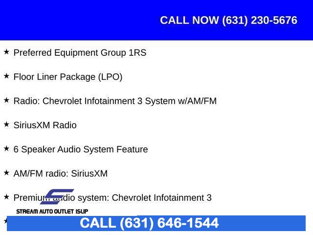Preferred Equipment Group 1RS, 3.87 Final Drive Axle Ratio, 19" Aluminum Wheels, Set of 4 Wheel Locks (LPO), Premium Cloth Seat Trim, Radio: Chevrolet Infotainment 3 System w/AM/FM, Floor Liner Package (LPO), Not Equipped w/Driver & Fr Pass Heated Seats, 8-Way Power Driver Seat Adjuster, Front Passenger 4-Way Manual Seat Adjuster, 2-Way Power Driver Lumbar Control Seat Adjuster, Integrated Cargo Liner (LPO), Heated Driver & Front Passenger Seats, All-Weather Floor Liners (LPO), SiriusXM Radio, Bluetooth® For Phone, 2 Rear USB Charging-Only Ports, 2 USB Ports & Auxiliary Input Jack, 6 Speaker Audio System Feature, 4-Wheel Disc Brakes, Wireless Apple CarPlay/Wireless Android Auto, Premium audio system: Chevrolet Infotainment 3, Emergency communication system: OnStar and Chevrolet connected services capable, Auto High-beam Headlights, AM/FM radio: SiriusXM, Compass, Front beverage holders, Variably intermittent wipers, Trip computer, Traction control, Tilt steering wheel, Telescoping steering wheel, Steering wheel mounted audio controls, Split folding rear seat, Speed-sensing steering, Speed control, Security system, Roof rack: rails only, Remote keyless entry, Rear window wiper, Rear window defroster, Rear seat center armrest, Rear reading lights, Rear anti-roll bar, Radio data system, Power windows, Power steering, Power driver seat, Power door mirrors, Passenger vanity mirror, Passenger door bin, Panic alarm, Overhead console, Overhead airbag, Outside temperature display, Occupant sensing airbag, Low tire pressure warning, Leather steering wheel, Illuminated entry, Heated front seats, Heated door mirrors, Fully automatic headlights, Front reading lights, Front dual zone A/C, Front anti-roll bar, Four wheel independent suspension, Dual front side impact airbags, Dual front impact airbags, Driver vanity mirror, Driver door bin, Delay-off headlights, Bumpers: body-color, Brake assist, Automatic temperature control, Alloy wheels, ABS brakes, Tachometer, Spoiler, Power Liftgate, Front Center Armrest, Front Bucket Seats, Electronic Stability Control, Air Conditioning, 6 Speakers