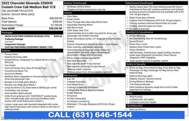Preferred Equipment Group 1CX, Snow Plow Prep/Camper Package, Suspension Package, 6 Speakers, 6-Speaker Audio System, AM/FM radio, Premium audio system: Chevrolet Infotainment 3, Radio: Chevrolet Infotainment 3 System, Air Conditioning, Bluetooth® For Phone, Power Front Windows w/Driver Express Up/Down, Power Front Windows w/Passenger Express Down, Power Rear Windows w/Express Down, Power steering, Power windows, Remote Keyless Entry, Remote keyless entry, Manual Tilt-Wheel Steering Column, Traction control, 4-Wheel Disc Brakes, ABS brakes, Dual front impact airbags, Dual front side impact airbags, Front anti-roll bar, Front wheel independent suspension, Locking Tailgate, Low tire pressure warning, Occupant sensing airbag, Overhead airbag, Power Door Locks, Brake assist, Electronic Stability Control, Delay-off headlights, Fully automatic headlights, Panic alarm, Electronic Cruise Control w/Set & Resume Speed, Speed control, 2-Speed Electronic Shift Transfer Case, 170 Amp Alternator, 220 Amp Alternator, 720 Cold-Cranking Amps Heavy-Duty Battery, Black Mirror Caps, Body Color Front Grille, Front License Plate Kit, Heated door mirrors, Heated Vertical Trailering Mirrors, Manual Tailgate Function w/No EZ Lift, Power door mirrors, Rear step bumper, Standard Tailgate, Turn signal indicator mirrors, 3.5" Diagonal Monochromatic Display DIC, Apple CarPlay/Android Auto, Cloth Seat Trim, Color-Keyed Carpeting Floor Covering, Driver door bin, Front 40/20/40 Split-Bench Seats, Front reading lights, Front Rubberized Vinyl Floor Mats, Illuminated entry, Outside temperature display, Overhead console, Passenger vanity mirror, Rear reading lights, Rear Rubberized Vinyl Floor Mats, Tachometer, Tilt steering wheel, Trip computer, Voltmeter, Rear 60/40 Folding Bench Seat (Folds Up), Split folding rear seat, Front Center Armrest w/Storage, Passenger door bin, Alloy wheels, Wheels: 20" 10-Spoke Machined Aluminum, Deep-Tinted Glass, Variably intermittent wipers, 3.73 Rear Axle Ratio