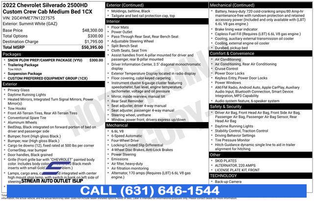For more information on this 2022 Chevrolet Silverado HD, please call Stream Auto Outlet Islip at (631) 646-1544 or with the contact form on this page. This vehicle's vin number is 2GC4YME77N1227575 and is recorded as being in stock at Stream Auto Outlet Islip at 2232 Sunrise Hwy in Islip. See all cars from this dealership.