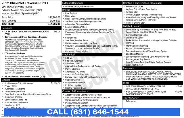2022 Chevrolet Traverse RS Mosaic Black Metallic 9-Speed Automatic * NYS INSPECTION INCLUDED *, * FULL INTERIOR / EXTERIOR DETAIL *, * BACK UP CAMERA *, * NAVIGATION SYSTEM *, * BLUETOOTH *, * LEATHER SEATS *, * LIMITED NYS LEMON LAW WARRANTY INCLUDED *, *FRESH OIL CHANGE *, * 150 MULTI POINT INSPECTION *, APPLE CAR PLAY/ANDROID AUTO, AWD, Front License Plate Bracket Mounting Package, Heated Driver & Front Passenger Seats, Heated Steering Wheel, Navigation System, Preferred Equipment Group 2LT, Rear Park Assist w/Audible Warning. CARFAX One-Owner. Odometer is 23530 miles below market average!