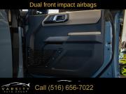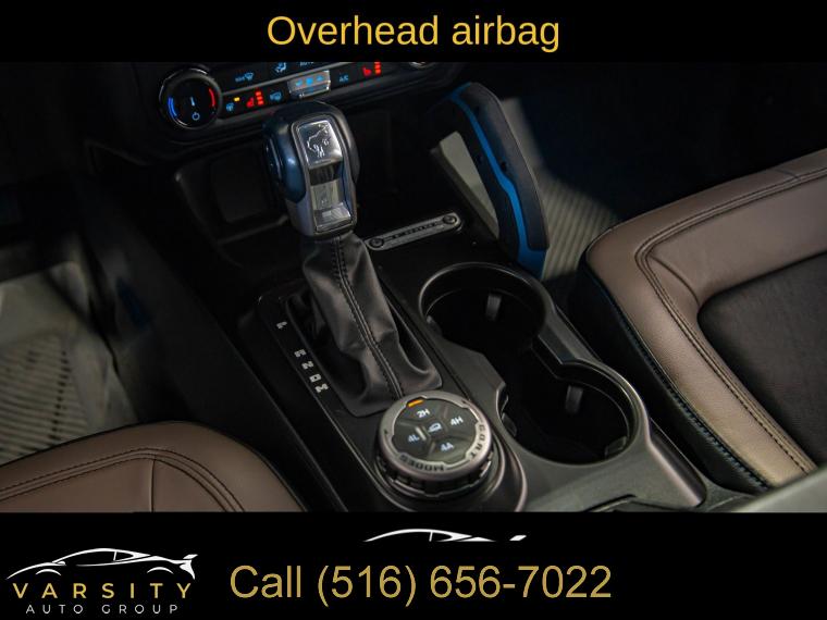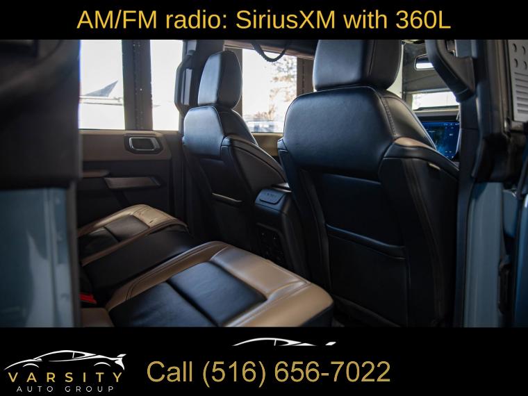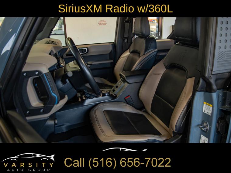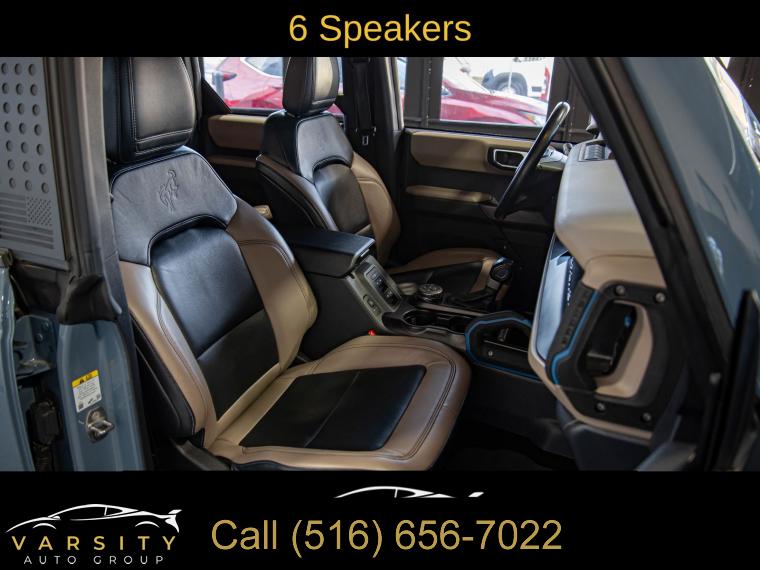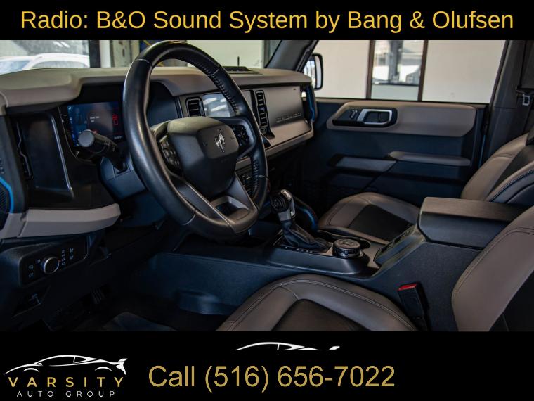 Equipment Group 354A Lux Package, 6 Speakers, AM/FM radio: SiriusXM with 360L, AM/FM Stereo, Radio data system, Radio: B&O Sound System by Bang & Olufsen, SiriusXM Radio w/360L, SYNC 4, Air Conditioning, Power steering, Power windows, Remote keyless entry, Steering wheel mounted audio controls, Universal Garage Door Opener, Traction control, 4-Wheel Disc Brakes, ABS brakes, Dual front impact airbags, Dual front side impact airbags, Emergency communication system: 911 Assist, Front anti-roll bar, Front wheel independent suspension, Integrated roll-over protection, Low tire pressure warning, Occupant sensing airbag, Overhead airbag, Brush Guard, Ford Performance Heavy-Duty Modular Front Bumper, Brake assist, Electronic Stability Control, Exterior Parking Camera Rear, Front Parking Sensors, Auto High-beam Headlights, Delay-off headlights, Fully automatic headlights, Keyless Entry Keypad, Panic alarm, Security system, Adaptive Cruise Control, Speed control, Front Steel Bash Plates, Heated door mirrors, Power door mirrors, Sideview Mirrors, 12" LCD Capacitive Touchscreen w/Swipe Capability, 2 Smart Charging USB Ports In Dashboard, 360-Degree Camera, Additional Sound Deadening, Compass, Connected Built-In Navigation, Driver door bin, Driver vanity mirror, Evasive Steering Assist, Front & Rear Floor Liners, Front reading lights, Heated Steering Wheel, Illuminated entry, Information on Demand Panel, Outside temperature display, Overhead console, Passenger vanity mirror, Tachometer, Telescoping steering wheel, Tilt steering wheel, Trip computer, Wireless Charging Pad, Front Bucket Seats, Front Center Armrest, Split folding rear seat, Passenger door bin, Alloy wheels, Wheels: 17" Black Gloss-Painted Steel, Variably intermittent wipers, 2022 Ford Bronco Wildtrak 4-Door, Area 51, Medium Sandstone w/Black Onyx w/Heated Leather-Trimmed/Vinyl Bucket Seats, 17" Black Aluminum Beadlock Black Ring Wheels, 35" tires, Clean CARFAX