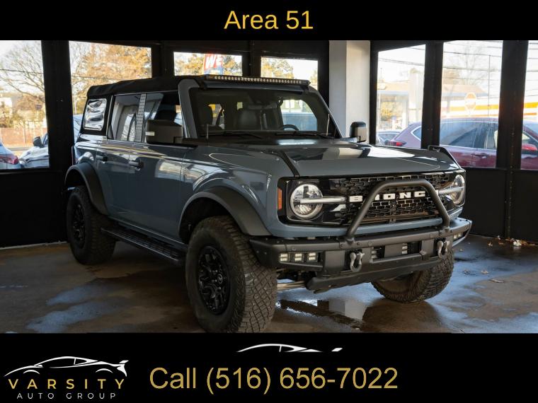 2022 Ford Bronco Wildtrak 4-Door, Area 51, Medium Sandstone w/Black Onyx w/Heated Leather-Trimmed/Vinyl Bucket Seats, Equipment Group 354A Lux Package, 17" Black Aluminum Beadlock Black Ring Wheels, 35" tires, Clean CARFAX, 12" LCD Capacitive Touchscreen w/Swipe Capability, 2 Smart Charging USB Ports In Dashboard, 360-Degree Camera, 4-Wheel Disc Brakes, 6 Speakers, ABS brakes, Adaptive Cruise Control, Additional Sound Deadening, Air Conditioning, Alloy wheels, AM/FM radio: SiriusXM with 360L, AM/FM Stereo, Auto High-beam Headlights, Brake assist, Brush Guard, Compass, Connected Built-In Navigation, Delay-off headlights, Driver door bin, Driver vanity mirror, Dual front impact airbags, Dual front side impact airbags, Electronic Stability Control, Emergency communication system: 911 Assist, Equipment Group 354A Lux Package, Evasive Steering Assist, Exterior Parking Camera Rear, Ford Performance Heavy-Duty Modular Front Bumper, Front & Rear Floor Liners, Front anti-roll bar, Front Bucket Seats, Front Center Armrest, Front Parking Sensors, Front reading lights, Front Steel Bash Plates, Front wheel independent suspension, Fully automatic headlights, Heated door mirrors, Heated Steering Wheel, Illuminated entry, Information on Demand Panel, Integrated roll-over protection, Keyless Entry Keypad, Low tire pressure warning, Occupant sensing airbag, Outside temperature display, Overhead airbag, Overhead console, Panic alarm, Passenger door bin, Passenger vanity mirror, Power door mirrors, Power steering, Power windows, Radio data system, Radio: B&O Sound System by Bang & Olufsen, Remote keyless entry, Security system, Sideview Mirrors, SiriusXM Radio w/360L, Speed control, Split folding rear seat, Steering wheel mounted audio controls, SYNC 4, Tachometer, Telescoping steering wheel, Tilt steering wheel, Traction control, Trip computer, Universal Garage Door Opener, Variably intermittent wipers, Wheels: 17" Black Gloss-Painted Steel, Wireless Charging Pad. Area 51 2022 Ford Bronco Wildtrak 4-Door 4WD 10-Speed Automatic 2.7L EcoBoost V6 Odometer is 3567 miles below market average!