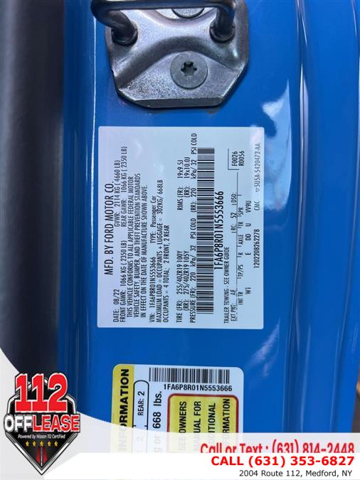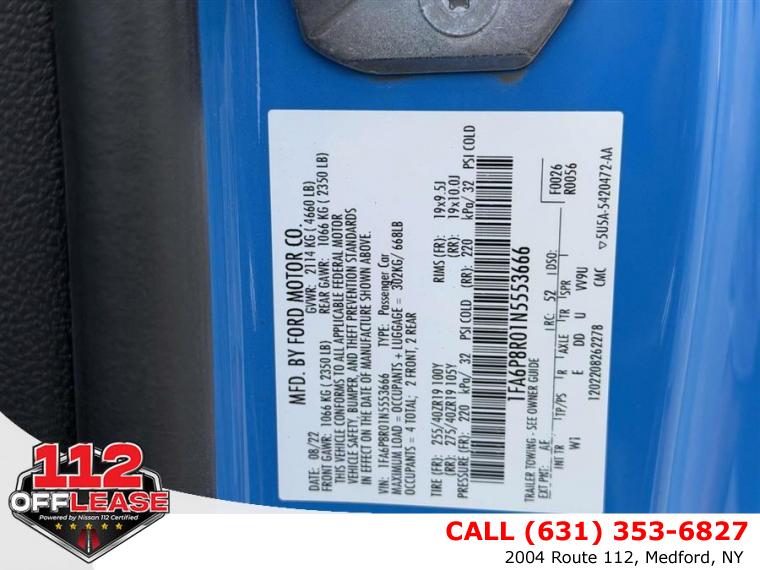 For more information on this 2022 Ford Mustang, please call 112 Off Lease at (631) 353-6827 or with the contact form on this page. This vehicle's vin number is 1FA6P8R01N5553666 and is recorded as being in stock at 112 Off Lease at 2004 Route 112 in Medford. See all cars from this dealership.