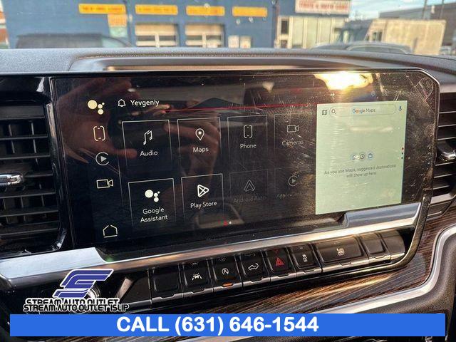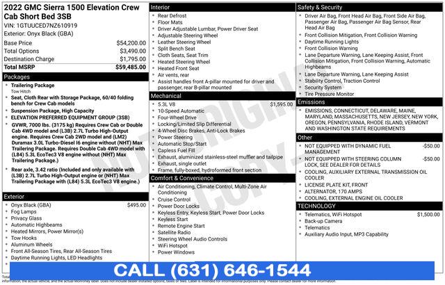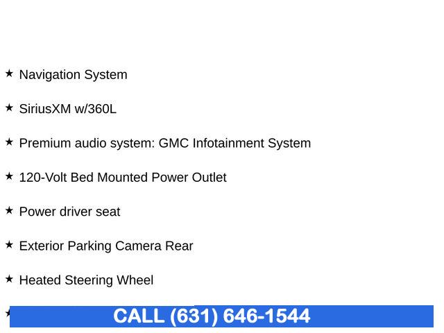 Navigation System, Cloth Rear Seat w/Storage Package, High Capacity Suspension Package, Preferred Equipment Group 3SB, Trailering Package, 6 Speakers, 6-Speaker Audio System Feature, AM/FM radio: SiriusXM with 360L, Premium audio system: GMC Infotainment System, Radio data system, Radio: Premium GMC Infotainment Audio System, SiriusXM w/360L, Steering Wheel Audio Controls, Air Conditioning, Automatic temperature control, Electric Rear-Window Defogger, Front dual zone A/C, Rear window defroster, 120-Volt Bed Mounted Power Outlet, 120-Volt Instrument Panel Power Outlet, Power driver seat, Power Front Windows w/Driver Express Up/Down, Power Front Windows w/Passenger Express Down, Power Rear Windows w/Express Down, Power steering, Power windows, Push Button Start, Remote keyless entry, Remote Vehicle Starter System, Steering wheel mounted audio controls, Auto-Locking Rear Differential, Manual Tilt-Wheel & Telescoping Steering Column, Speed-sensing steering, Traction control, 4-Wheel Disc Brakes, ABS brakes, Dual front impact airbags, Dual front side impact airbags, Electrical Steering Column Lock, Emergency communication system: OnStar and GMC Connected Services capable, Front anti-roll bar, Front wheel independent suspension, Keyless Open & Start, Low tire pressure warning, Not Equipped w/Steering Column Lock, Occupant sensing airbag, Overhead airbag, Power Door Locks, Brake assist, Electronic Stability Control, Exterior Parking Camera Rear, Auto High-beam Headlights, Delay-off headlights, Front fog lights, Fully automatic headlights, 3 Years of OnStar & Connected Services Plan, Panic alarm, Security system, Theft Deterrent System (Unauthorized Entry), Speed control, 170 Amp Alternator, 220 Amp Alternator, Auxiliary External Transmission Oil Cooler, External Engine Oil Cooling, Not Equipped w/Dynamic Fuel Management, Body Color Header w/Gloss Black Mesh Grille Bars, Bumpers: body-color, Front License Plate Kit, Heated door mirrors, IntelliBeam Automatic High Beam On/Off, LED Cargo Area Lighting, Power door mirrors, Rear step bumper, 2 Charge/Data USB Ports, 2 Type-C Charge-Only Rear USB Ports, Apple CarPlay/Android Auto, Automatic Emergency Braking, Buckle to Drive, Cloth Seat Trim, Color-Keyed Carpeting Floor Covering, Compass, Driver door bin, Driver vanity mirror, Following Distance Indicator, Forward Collision Alert, Front Pedestrian Braking, Front reading lights, Front Rubberized-Vinyl Floor Mats, GMC Connected Access Capable, HD Rear Vision Camera, Heated Steering Wheel, Heated steering wheel, Illuminated entry, Lane Keep Assist w/Lane Departure Warning, OnStar & GMC Connected Services Capable, Outside temperature display, Overhead console, Passenger vanity mirror, Rear reading lights, Rear Rubberized-Vinyl Floor Mats, Rear seat center armrest, Tachometer, Telescoping steering wheel, Tilt steering wheel, Trip computer, Voltmeter, Wi-Fi Hotspot Capable, Wireless Phone Projection, 10-Way Power Driver Seat Adjuster w/Lumbar, 4-Way Manual Passenger Seat Adjuster, Front 40/20/40 Split-Bench Seat, Heated Driver & Front Outboard Passenger Seating, Heated front seats, Split folding rear seat, Front Center Armrest w/Storage, Passenger door bin, Front Frame-Mounted Black Recovery Hooks, Hitch Guidance, Alloy wheels, Wheels: 20" x 9" High Gloss Black Painted Aluminum, Deep-Tinted Glass, Variably intermittent wipers