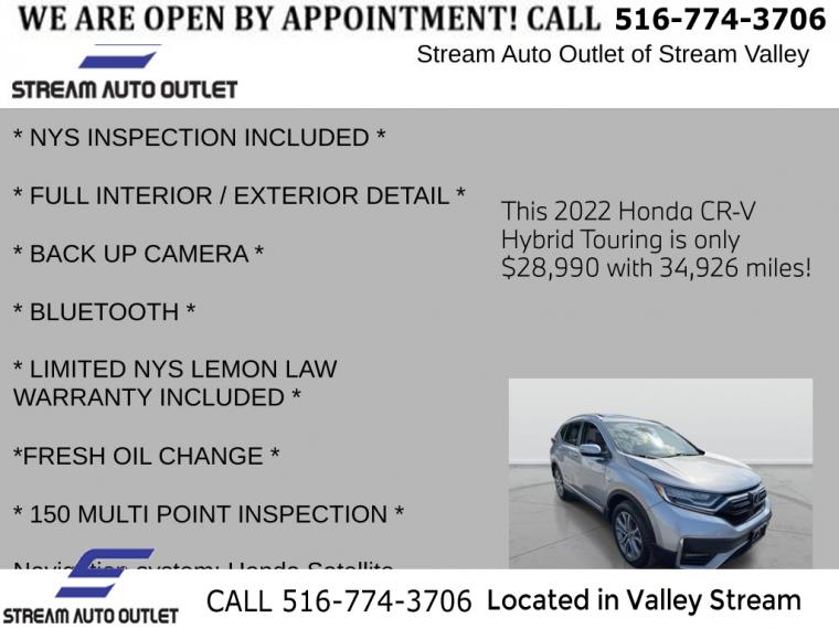For more information on this 2022 Honda CR-V, please call Stream Auto Outlet Valley Stream at (516) 774-3706 or with the contact form on this page. This vehicle's vin number is 5J6RT6H97NL034926 and is recorded as being in stock at Stream Auto Outlet Valley Stream at 324 W Merrick Rd in Valley Stream. See all cars from this dealership.