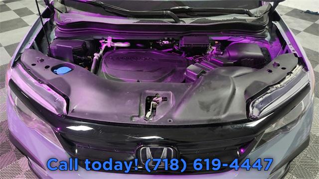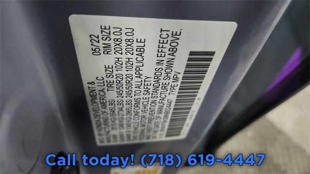 7 Speakers, AM/FM radio: SiriusXM, Radio data system, Radio: 215-Watt Audio System, Air Conditioning, Automatic temperature control, Front dual zone A/C, Rear air conditioning, Rear window defroster, Power driver seat, Power steering, Power windows, Remote keyless entry, Steering wheel mounted audio controls, A/V remote: CabinControl, Four wheel independent suspension, Speed-sensing steering, Traction control, 4-Wheel Disc Brakes, ABS brakes, Dual front impact airbags, Dual front side impact airbags, Emergency communication system: HondaLink Assist, Front anti-roll bar, Low tire pressure warning, Occupant sensing airbag, Overhead airbag, Rear anti-roll bar, Blind Spot Information (BSI) System warning, Brake assist, Electronic Stability Control, Forward collision: Collision Mitigation Braking System (CMBS) + FCW mitigation, Lane departure: Lane Keeping Assist System (LKAS) active, Exterior Parking Camera Rear, Auto High-beam Headlights, Delay-off headlights, Front fog lights, Fully automatic headlights, Panic alarm, Security system, Speed control, Bumpers: body-color, Heated door mirrors, Power door mirrors, Roof rack: rails only, Spoiler, Turn signal indicator mirrors, Apple CarPlay/Android Auto, Cloth Seat Trim, Driver door bin, Driver vanity mirror, Front reading lights, Illuminated entry, Outside temperature display, Overhead console, Passenger vanity mirror, Rear reading lights, Rear seat center armrest, Tachometer, Telescoping steering wheel, Tilt steering wheel, Trip computer, 3rd row seats: split-bench, Front Bucket Seats, Front Center Armrest, Heated Front Bucket Seats, Heated front seats, Reclining 3rd row seat, Split folding rear seat, Passenger door bin, Alloy wheels, Wheels: 20" Pewter Gray Alloy, Rear window wiper, Speed-Sensitive Wipers, Variably intermittent wipers, 4.33 Axle Ratio