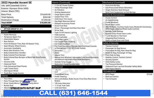 For more information on this 2022 Hyundai Accent, please call Stream Auto Outlet Islip at (631) 646-1544 or with the contact form on this page. This vehicle's vin number is 3KPC24A69NE157414 and is recorded as being in stock at Stream Auto Outlet Islip at 2232 Sunrise Hwy in Islip. See all cars from this dealership.
