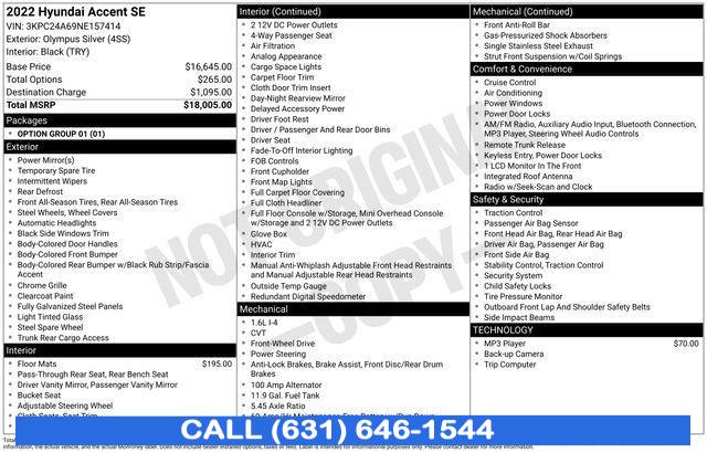 2022 Hyundai Accent Olympus Silver Metallic * NYS INSPECTION INCLUDED *, * FULL INTERIOR / EXTERIOR DETAIL *, * BLUETOOTH *, * LIMITED NYS LEMON LAW WARRANTY INCLUDED *, *FRESH OIL CHANGE *, * 150 MULTI POINT INSPECTION *, Black Cloth. Odometer is 12073 miles below market average! 33/41 City/Highway MPG Priced below KBB Fair Purchase Price!