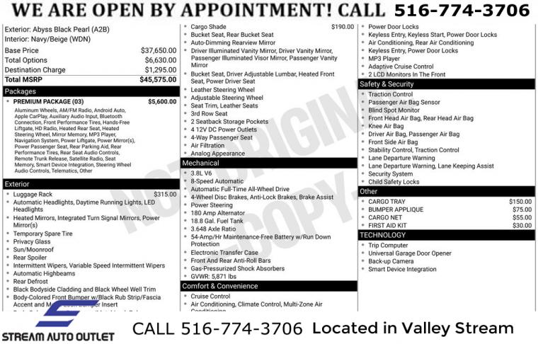 Convenience Package P2, Premium Package, Premium Package P3, 6 Speakers, AM/FM radio, Radio data system, Radio: AM/FM/MP3 Display Audio, Radio: AM/FM/MP3 Premium Audio System, Rear audio controls, Air Conditioning, Automatic temperature control, Front dual zone A/C, Rear air conditioning, Rear window defroster, 115-Volt AC Power Outlet, 8-Way Power Passenger Seat, Heated 2nd Row Seats, Power driver seat, Power steering, Power windows, Remote keyless entry, Steering wheel mounted audio controls, Auto Leveling Rear Suspension, Four wheel independent suspension, Speed-sensing steering, Traction control, 4-Wheel Disc Brakes, ABS brakes, Dual front impact airbags, Dual front side impact airbags, Front anti-roll bar, Hands-Free Smart Liftgate, Knee airbag, Low tire pressure warning, Occupant sensing airbag, Overhead airbag, Rear anti-roll bar, Power moonroof, Bumper Applique, Brake assist, Electronic Stability Control, Front Parking Sensors, Auto High-beam Headlights, Delay-off headlights, Fully automatic headlights, LED Taillights, Acoustic Front Side Glass, First Aid Kit, Panic alarm, Security system, Speed control, Bumpers: body-color, Heated door mirrors, Power door mirrors, Spoiler, Turn signal indicator mirrors, 3rd Row USB Outlets, 7" High-Resolution Cluster Display, Apple CarPlay & Android Auto, Auto-dimming Rear-View mirror, Carpeted Floor Mats, Cloth Seat Trim, Driver door bin, Driver vanity mirror, Driver's Seat Integrated Memory System, Front reading lights, Garage door transmitter: HomeLink, Heated Steering Wheel, Highway Drive Assist I, Illuminated entry, Outside temperature display, Overhead console, Passenger vanity mirror, Premium Dashboard & Door Armrests, Rear reading lights, Tachometer, Telescoping steering wheel, Tilt steering wheel, Trip computer, Ultrasonic Rear Occupant Alert, Wireless Phone Charger, 3rd row seats: split-bench, Front Bucket Seats, Front Center Armrest, Heated Front Bucket Seats, Heated front seats, Leather Seat Trim, Power 3rd Row Seating, Reclining 3rd row seat, Split folding rear seat, Cargo Cover/Screen, Cargo Net, Cargo Tray, Passenger door bin, Roof Rack Cross Rails, Alloy wheels, Wheels: 18" x 7.5J Machine Finish Alloy, Wheels: 20" x 7.5J Split 5-Spoke Machined Alloy, Rear Side Window Sunshades, Rear window wiper, Variably intermittent wipers, 3.648 Axle Ratio, * NYS INSPECTION INCLUDED *, * FULL INTERIOR / EXTERIOR DETAIL *, * BLUETOOTH *, * LIMITED NYS LEMON LAW WARRANTY INCLUDED *, *FRESH OIL CHANGE *, * 150 MULTI POINT INSPECTION *