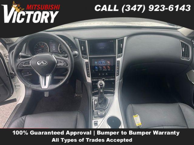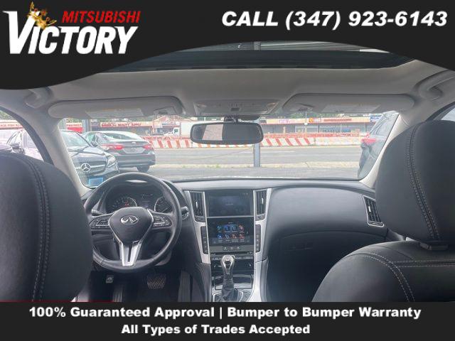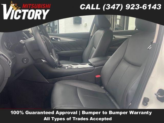 Welcome to Victory Mitsubishi! We offer a combined inventory of 700 cars new and luxury used vehicles. All Used vehicles come with a quality assurance inspection, our New Vehicles have an unprecedented 10-year 100k mile warranty we also have vehicles car for any want or purpose. Come into test drive this car for any want or purpose. Come in to test drive this INFINITI Q50 LUXE today! Priced below KBB Fair Purchase Price! *Perfect One Owner Carfax History!, 18" x 7.5" Aluminum Alloy Wheels, AM/FM radio: SiriusXM, Bumpers: body-color, Cargo Net, Cargo Package, Delay-off headlights, Driver door bin, Dual front side impact airbags, Electronic Stability Control, Emergency communication system: INFINITI Connection, First Aid Kit, Heated front seats, Passenger vanity mirror, Power driver seat, Power moonroof, Power passenger seat, Radio: INFINITI InTouch w/AM/FM/HD/CD, Rear window defroster, Remote keyless entry, Security system, Shopping Bag Hooks, Speed control, Steering wheel mounted audio controls, Traction control, Trunk Mat, Turn signal indicator mirrors, Variably intermittent wipers.
