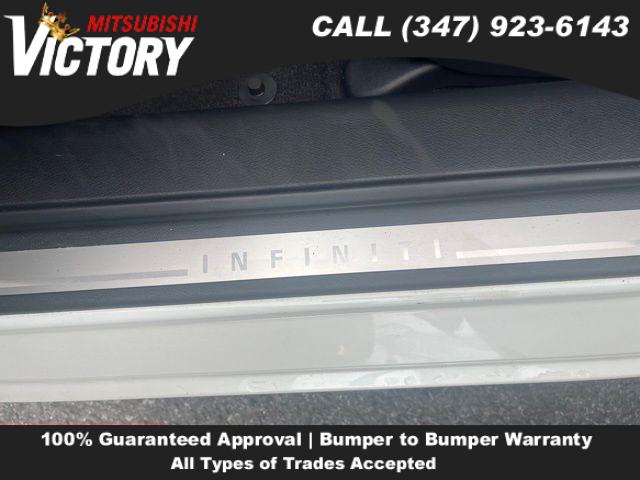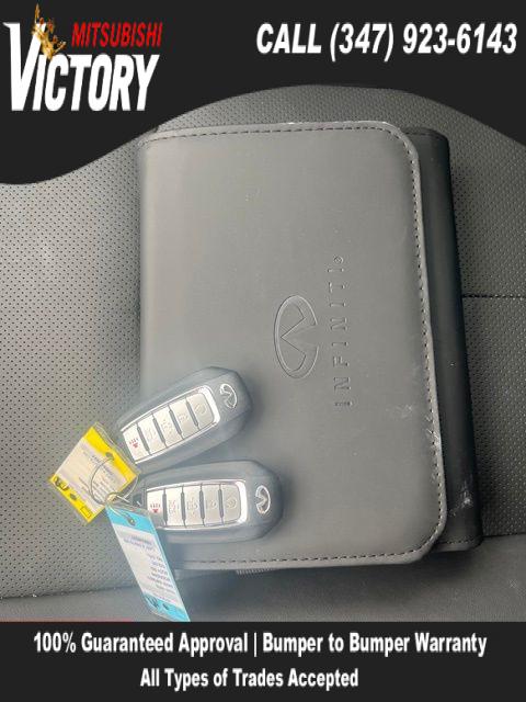 Cargo Package, 16 Speakers, AM/FM radio: SiriusXM, CD player, Radio data system, Radio: INFINITI InTouch w/AM/FM/HD/CD, Air Conditioning, Automatic temperature control, Front dual zone A/C, Rear window defroster, Memory seat, Power driver seat, Power steering, Power windows, Remote keyless entry, Steering wheel memory, Steering wheel mounted audio controls, Four wheel independent suspension, Traction control, 4-Wheel Disc Brakes, ABS brakes, Dual front impact airbags, Dual front side impact airbags, Emergency communication system: INFINITI Connection, Front anti-roll bar, Low tire pressure warning, Occupant sensing airbag, Overhead airbag, Rear anti-roll bar, Power moonroof, Blind Spot Warning, Brake assist, Electronic Stability Control, Auto High-beam Headlights, Delay-off headlights, Front fog lights, Fully automatic headlights, First Aid Kit, Panic alarm, Security system, Speed control, Bumpers: body-color, Heated door mirrors, Power door mirrors, Splash Guards, Turn signal indicator mirrors, ., Apple CarPlay/Android Auto, Auto tilt-away steering wheel, Auto-dimming Rear-View mirror, Compass, Driver door bin, Driver vanity mirror, Front reading lights, Garage door transmitter: HomeLink, Heated steering wheel, Illuminated entry, Leather Shift Knob, Leather steering wheel, Outside temperature display, Overhead console, Passenger vanity mirror, Rear reading lights, Rear seat center armrest, Rear USB Charging Ports, Shopping Bag Hooks, Tachometer, Telescoping steering wheel, Tilt steering wheel, Trip computer, Trunk Mat, Front Bucket Seats, Front Center Armrest, Heated Front Bucket Seats, Heated front seats, Leather Seating Surfaces, Power passenger seat, Split folding rear seat, Cargo Net, Passenger door bin, 18" x 7.5" Aluminum Alloy Wheels, Alloy wheels, Rain sensing wipers, Speed-Sensitive Wipers, Variably intermittent wipers, *Perfect One Owner Carfax History!