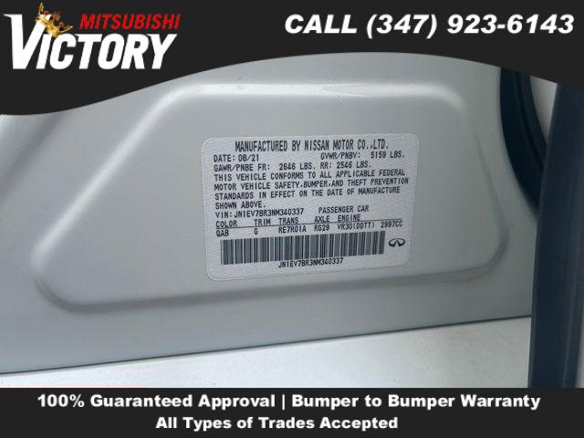 2022 INFINITI Q50 LUXE Majestic White 4D Sedan Save yourself Time and Money - Fill out a credit application online at victorymitsubishi.com and get pre-APPROVED! Financing available for all types of credit with low monthly payment that will fit you budget. Down Payment low as $599. Same day delivery. View our entire inventory by visiting our virtual showroom at victorymitsubishi.com - Only 2 blocks away from Exit 13 off I-95 or Minutes from exit 7 on the Hutchinson Parkway. While we make every effort to ensure the data listed here is correct, there may be instances where the pricing, options or vehicle features may be listed incorrectly. Dealer cannot be held liable for data that is listed incorrectly. to see more pictures of this vehicle or call us at (347) 923-6143 today to schedule your test drive. please refer to dealer’s website for exact pricing and for any incentives that we may apply! Our address is 4070 Boston Road, Bronx, NY 10475.