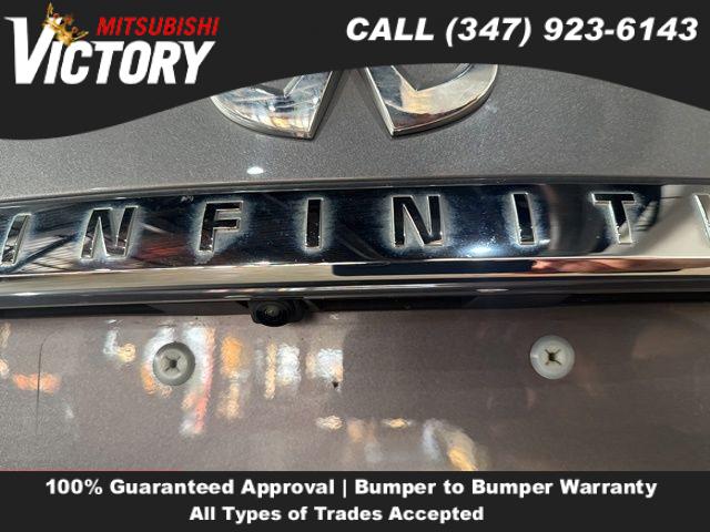 All Weather Package, Cargo Package, 16 Speakers, AM/FM radio: SiriusXM, CD player, Radio data system, Radio: INFINITI InTouch w/AM/FM/HD/CD, Air Conditioning, Automatic temperature control, Front dual zone A/C, Rear window defroster, Memory seat, Power driver seat, Power steering, Power windows, Remote keyless entry, Steering wheel memory, Steering wheel mounted audio controls, Four wheel independent suspension, Traction control, 4-Wheel Disc Brakes, ABS brakes, Dual front impact airbags, Dual front side impact airbags, Emergency communication system: INFINITI Connection, Front anti-roll bar, Low tire pressure warning, Occupant sensing airbag, Overhead airbag, Rear anti-roll bar, Power moonroof, Blind Spot Warning, Brake assist, Electronic Stability Control, Auto High-beam Headlights, Delay-off headlights, Front fog lights, Fully automatic headlights, First Aid Kit, Panic alarm, Security system, Speed control, Bumpers: body-color, Heated door mirrors, Power door mirrors, Rear Decklid Spoiler, Splash Guards, Turn signal indicator mirrors, ., All-Season Floor Mats, Apple CarPlay/Android Auto, Auto tilt-away steering wheel, Auto-dimming Rear-View mirror, Compass, Driver door bin, Driver vanity mirror, Front reading lights, Garage door transmitter: HomeLink, Heated steering wheel, Illuminated entry, INFINITI Radiant Illuminated Kick Plates, INFINITI Radiant Welcome Lighting, Leather Shift Knob, Leather steering wheel, Outside temperature display, Overhead console, Passenger vanity mirror, Rear reading lights, Rear seat center armrest, Rear USB Charging Ports, Shopping Bag Hooks, Tachometer, Telescoping steering wheel, Tilt steering wheel, Trip computer, Trunk Mat, Trunk Protector, Front Bucket Seats, Front Center Armrest, Heated Front Bucket Seats, Heated front seats, Leather Seating Surfaces, Power passenger seat, Split folding rear seat, Cargo Net, Passenger door bin, 18" x 7.5" Aluminum Alloy Wheels, Alloy wheels, Rain sensing wipers, Speed-Sensitive Wipers, Variably intermittent wipers,