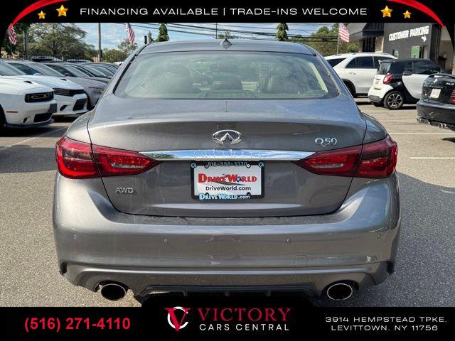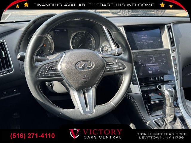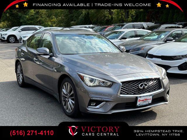 All pricing and details are believed to be accurate, but we do not warrant or guarantee such accuracy. The prices shown above may vary from region to region, as will incentives, and are subject to change. All cars are sold cosmetically As-Is. Vehicle information is based on standard equipment and may vary from vehicle to vehicle. Call or email for complete vehicle specific information. Price Does not include tax, title, license, destination charges, finance charges, or any reconditioning fees. Our special Internet pricing cannot be extended without a printed copy of the online pricing. The in-store price may exceed our special online pricing. Sorry but we cannot extend special pricing without a printed copy of the on-line pricing. To take advantage of our special Internet discounts, please print this page and present it to your salesperson at the BEGINNING of the transaction. Special Internet pricing posted on this ad/coupon/promotion is only available to customers who reference such pricing & present the ad at time of sale otherwise our store standard list price applies. Please be advised this ad is a Special Internet only ad. Prices can be modified and adjusted weekly, daily and sometimes hourly due to inquiries, bidding and website traffic on any Vehicles. All displayed inventory is subject to prior sale and all prices expire at midnight on the date displayed. Every reasonable effort has been made to ensure the accuracy of the information contained on this site, however absolute accuracy cannot be guaranteed. Advertised special excludes state tax, title, license, registration, NY state inspection, NYS tire recycling fee, finance charges, and dealer fees if applicable. Please verify any information in question with the dealership sales manager. This is easily done by calling us at (516) 271-4110 or by visiting us at the dealership. **With approved credit. Graphite Shadow 2022 INFINITI Q50 LUXE AWD 7-Speed Automatic with Overdrive 3.0L V6