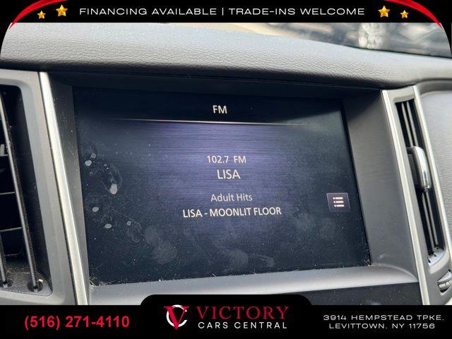 Cargo Package, 16 Speakers, AM/FM radio: SiriusXM, CD player, Radio data system, Radio: INFINITI InTouch w/AM/FM/HD/CD, Air Conditioning, Automatic temperature control, Front dual zone A/C, Rear window defroster, Memory seat, Power driver seat, Power steering, Power windows, Remote keyless entry, Steering wheel memory, Steering wheel mounted audio controls, Four wheel independent suspension, Traction control, 4-Wheel Disc Brakes, ABS brakes, Dual front impact airbags, Dual front side impact airbags, Emergency communication system: INFINITI Connection, Front anti-roll bar, Low tire pressure warning, Occupant sensing airbag, Overhead airbag, Rear anti-roll bar, Power moonroof, Blind Spot Warning, Brake assist, Electronic Stability Control, Auto High-beam Headlights, Delay-off headlights, Front fog lights, Fully automatic headlights, First Aid Kit, Panic alarm, Security system, Speed control, Bumpers: body-color, Heated door mirrors, Power door mirrors, Splash Guards, Turn signal indicator mirrors, Apple CarPlay/Android Auto, Auto tilt-away steering wheel, Auto-dimming Rear-View mirror, Compass, Driver door bin, Driver vanity mirror, Front reading lights, Garage door transmitter: HomeLink, Heated steering wheel, Illuminated entry, Leather Shift Knob, Leather steering wheel, Literature Kit, Outside temperature display, Overhead console, Passenger vanity mirror, Rear reading lights, Rear seat center armrest, Rear USB Charging Ports, Shopping Bag Hooks, Tachometer, Telescoping steering wheel, Tilt steering wheel, Trip computer, Trunk Mat, Front Bucket Seats, Front Center Armrest, Heated Front Bucket Seats, Heated front seats, Leather Seating Surfaces, Power passenger seat, Split folding rear seat, Cargo Net, Passenger door bin, 18" x 7.5" Aluminum Alloy Wheels, Alloy wheels, Rain sensing wipers, Speed-Sensitive Wipers, Variably intermittent wipers