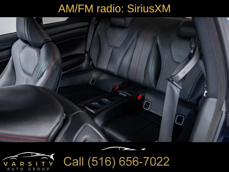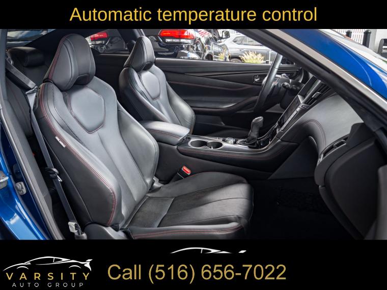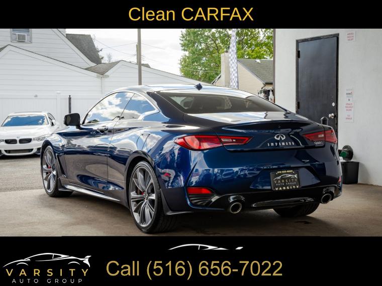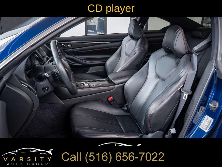 Q60 Red Sport 400, Grand Blue, Graphite Leather, Cargo Package, Clean CARFAX, Apple CarPlay/Android Auto, ProACTIVE Package, 1 Owner, Low Miles, 13 Speakers, 4-Wheel Disc Brakes, ABS brakes, Active Lane Control, Adaptive Front Lighting System, Adaptive suspension, Air Conditioning, Alloy wheels, AM/FM radio: SiriusXM, Apple CarPlay/Android Auto, Auto High-beam Headlights, Auto tilt-away steering wheel, Auto-dimming door mirrors, Auto-dimming Rear-View mirror, Automatic temperature control, Blind Spot Warning, Blind-Spot Intervention, Brake assist, Bumpers: body-color, Cargo Net, Cargo Package, Carpeted Trunk Mat, CD player, Compass, Delay-off headlights, Direct Adaptive Steering, Driver door bin, Driver vanity mirror, Dual front impact airbags, Dual front side impact airbags, ECO Pedal, Electronic Stability Control, Emergency communication system: INFINITI Connection, First Aid Kit, Four wheel independent suspension, Front anti-roll bar, Front Bucket Seats, Front Center Armrest, Front dual zone A/C, Front fog lights, Front reading lights, Front Seat Driver/Passenger Pre-Crash Seatbelts, Fully automatic headlights, Garage door transmitter: HomeLink, Heated door mirrors, Heated Front Bucket Seats, Heated front seats, Heated steering wheel, Illuminated entry, Illuminated Kick Plates, INFINITI Welcome Lighting, Lane Departure Prevention, Leather Shift Knob, Leather steering wheel, Literature Kit, Low tire pressure warning, Memory seat, Navigation system: INFINITI InTouch Navigation, Occupant sensing airbag, Outside temperature display, Overhead airbag, Overhead console, Panic alarm, Passenger door bin, Passenger vanity mirror, Power door mirrors, Power driver seat, Power moonroof, Power passenger seat, Power steering, Power windows, ProACTIVE Package, Radio data system, Radio: INFINITI InTouch w/AM/FM/HD/CD/Navigation, Rain sensing wipers, Rear anti-roll bar, Rear window defroster, Remote keyless entry, Security system, Semi-Aniline Leather-Appointed Seating Surfaces, Special Paint - Grand Blue, Speed control, Speed-sensing steering, Speed-Sensitive Wipers, Steering wheel memory, Steering wheel mounted audio controls, Tachometer, Telescoping steering wheel, Tilt steering wheel, Traction control, Trip computer, Turn signal indicator mirrors, Variably intermittent wipers, Wheels: 20" Staggered Aluminum-Alloy Sport. Grand Blue 2022 INFINITI Q60 Red Sport 400 RWD 7-Speed Automatic 3.0L V6 20/27 City/Highway MPG