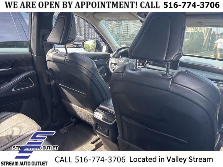 Navigation system: INFINITI InTouch Navigation, Cargo Package, 17 Speakers, AM/FM radio: SiriusXM, Bose Performance Series 17-Speaker Sound System, Radio data system, Radio: AM/FM Audio System, Air Conditioning, Automatic temperature control, Front dual zone A/C, Rear air conditioning, Rear window defroster, Memory seat, Power driver seat, Power steering, Power windows, Remote keyless entry, Steering wheel memory, Steering wheel mounted audio controls, Four wheel independent suspension, Speed-sensing steering, Traction control, 4-Wheel Disc Brakes, ABS brakes, Anti-whiplash front head restraints, Dual front impact airbags, Dual front side impact airbags, Emergency communication system, Front anti-roll bar, Knee airbag, Low tire pressure warning, Occupant sensing airbag, Overhead airbag, Rear anti-roll bar, Rear side impact airbag, Power moonroof, Power Liftgate, Brake assist, Electronic Stability Control, Auto High-beam Headlights, Delay-off headlights, Fully automatic headlights, First Aid Kit, Panic alarm, Security system, Speed control, Auto-dimming door mirrors, Bumpers: body-color, Heated door mirrors, Power door mirrors, Roof rack: rails only, Splash Guards, Spoiler, Turn signal indicator mirrors, Auto-dimming Rear-View mirror, Cargo Mat (Reversible), Driver door bin, Driver vanity mirror, Floor Mats, Front reading lights, Garage door transmitter: HomeLink, Heated steering wheel, Illuminated entry, Illuminated Kick Plates, Leather Shift Knob, Leather steering wheel, Literature Kit, Outside temperature display, Overhead console, Passenger vanity mirror, Rear reading lights, Rear seat center armrest, Tachometer, Telescoping steering wheel, Tilt steering wheel, Trip computer, 3rd row seats: bench, Front Bucket Seats, Front Center Armrest, Heated & Cooled Front Bucket Seats, Heated front seats, Heated rear seats, Leather-Appointed Seating Surfaces, Power passenger seat, Reclining 3rd row seat, Split folding rear seat, Ventilated front seats, Passenger door bin, Silver Roof Rail Cross Bars, Alloy wheels, Wheels: 20" x 8J Luxury Machined Aluminum Alloy, Rain sensing wipers, Rear window wiper, Speed-Sensitive Wipers, Variably intermittent wipers, 4.334 Axle Ratio, * NYS INSPECTION INCLUDED *, * FULL INTERIOR / EXTERIOR DETAIL *, * BLUETOOTH *, * LIMITED NYS LEMON LAW WARRANTY INCLUDED *, *FRESH OIL CHANGE *, * 150 MULTI POINT INSPECTION *