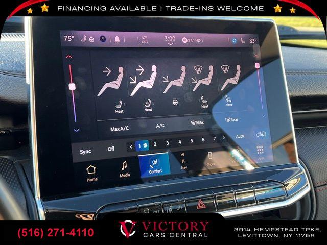 GPS Navigation, Quick Order Package 2GE, Trailhawk Elite Group, 6 Speakers, AM/FM radio: SiriusXM, HD Radio, Integrated Voice Command w/Bluetooth, No Satellite Coverage HI/AK/PR/VI/GU, Radio: Uconnect 5 Nav w/10.1" Display, Radio: Uconnect 5 w/10.1" Display, SiriusXM Radio Service, SiriusXM Satellite Radio, SiriusXM w/360L, Air Conditioning, Automatic temperature control, Front dual zone A/C, Rear window defroster, Driver Seat Memory, Power steering, Power windows, Remote keyless entry, Steering wheel mounted audio controls, Four wheel independent suspension, Traction control, 4-Wheel Disc Brakes, ABS brakes, Anti-whiplash front head restraints, Dual front impact airbags, Dual front side impact airbags, Emergency communication system: SiriusXM Guardian, Foot Activated Open 'N Go Liftgate, Front anti-roll bar, Knee airbag, Low tire pressure warning, Occupant sensing airbag, Overhead airbag, Rear anti-roll bar, Remote Start System, Power Liftgate, Brake assist, Electronic Stability Control, ParkView Rear Back-Up Camera, Auto High-beam Headlights, Delay-off headlights, Front fog lights, Fully automatic headlights, Panic alarm, Security system, Speed control, Bumpers: body-color, Front License Plate Bracket, Heated door mirrors, LED Low/Highbeam Projector Headlamps, Power door mirrors, Premium LED Fog Lamps, Premium Taillamps, Roof rack: rails only, Spoiler, Turn signal indicator mirrors, 10.1" Touchscreen Display, 115V Auxiliary Power Outlet, 2nd Row USB Type A/C Charge Only, 4G LTE Wi-Fi Hot Spot, Alexa Built-In, Auto-dimming Rear-View mirror, Cluster 10.25" TFT Color Display, Compass, Connected Travel & Traffic Services, Disassociated Touchscreen Display, Driver door bin, Driver vanity mirror, For Details, Visit DriveUconnect.com, For More Info, Call 800-643-2112, Front reading lights, Global Telematics Box Module (TBM), Illuminated entry, Leather Shift Knob, Leather Wrapped Steering Wheel, Outside temperature display, Overhead console, Passenger vanity mirror, Premium Cloth/Leather Trim Bucket Seats, Rear seat center armrest, Reversible Carpet/Vinyl Cargo Mat, SiriusXM Guardian - Included Trial (B), Tachometer, Telescoping steering wheel, Tilt steering wheel, Trip computer, Vehicle Information Center, 2nd Row Heated Seats, Front Bucket Seats, Heated Front Seats, Power 8-Way Adjust Front Passenger Seat, Power Adjust 8-Way Driver Seat, Premium Leather Trimmed Bucket Seats, Split folding rear seat, Ventilated Front Seats, Front Center Armrest w/Storage, Passenger door bin, Alloy wheels, Wheels: 17" x 6.5" Painted Diamond Cut Aluminum, Rain sensing wipers, Rear window wiper, Variably intermittent wipers, Windshield Wiper De-Icer, 4.334 Axle Ratio