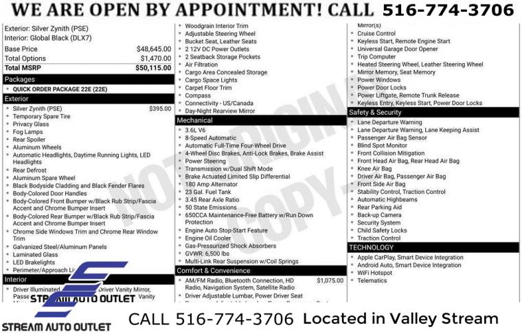 GPS Navigation, Quick Order Package 22E, 506 Watt Amplifier, 6 Speakers, 9 Amplified Speakers w/Subwoofer, Active Noise Control System, AM/FM radio: SiriusXM with 360L, Audio memory, GPS Antenna Input, HD Radio, Integrated Center Stack Radio, Radio data system, Radio: Uconnect 5 Nav w/10.1" Display, Radio: Uconnect 5 w/8.4" Display, SiriusXM Radio Service, SiriusXM Satellite Radio, SiriusXM w/360L, Air Conditioning, Automatic temperature control, Front dual zone A/C, Rear air conditioning, Rear window defroster, Memory seat, Power driver seat, Power steering, Power windows, Remote keyless entry, Steering wheel mounted audio controls, Four wheel independent suspension, Normal Duty Suspension, Traction control, 4-Wheel Disc Brakes, ABS brakes, Anti-whiplash front head restraints, Dual front impact airbags, Dual front side impact airbags, Emergency communication system, Front anti-roll bar, Knee airbag, Low tire pressure warning, Occupant sensing airbag, Overhead airbag, Rear anti-roll bar, Power Liftgate, Brake assist, Electronic Stability Control, ParkView Rear Back-Up Camera, Auto High-beam Headlights, Delay-off headlights, Front fog lights, Fully automatic headlights, Panic alarm, Security system, Speed control, Bumpers: body-color, Heated door mirrors, Power door mirrors, Spoiler, Turn signal indicator mirrors, USB Host Flip, 10.1" Touchscreen Display, 4G LTE Wi-Fi Hot Spot, All Radio Equipped Vehicles, Apple CarPlay, Capri Leather Seats, Compass, Connected Travel & Traffic Services, Connectivity - US/Canada, Disassociated Touchscreen Display, Driver door bin, Driver vanity mirror, For Details, Visit DriveUconnect.com, For More Info, Call 800-643-2112, Front reading lights, Garage door transmitter, Global Telematics Box Module (TBM), Google Android Auto, Heated steering wheel, Illuminated entry, Integrated Voice Command w/Bluetooth, Leather steering wheel, Outside temperature display, Overhead console, Passenger vanity mirror, Rear reading lights, Tachometer, Telescoping steering wheel, Tilt steering wheel, Trip computer, Voltmeter, 3rd row seats: split-bench, Front Bucket Seats, Heated front seats, Heated rear seats, Manual Fold Seatbacks, Power passenger seat, Reclining 3rd row seat, Split folding rear seat, Front Center Armrest w/Storage, Passenger door bin, Alloy wheels, Wheels: 18" x 8.0" Fully Painted Aluminum 2, Rear window wiper, Speed-Sensitive Wipers, Variably intermittent wipers, 3.45 Rear Axle Ratio, * NYS INSPECTION INCLUDED *, * FULL INTERIOR / EXTERIOR DETAIL *, * BLUETOOTH *, * LIMITED NYS LEMON LAW WARRANTY INCLUDED *, *FRESH OIL CHANGE *, * 150 MULTI POINT INSPECTION *