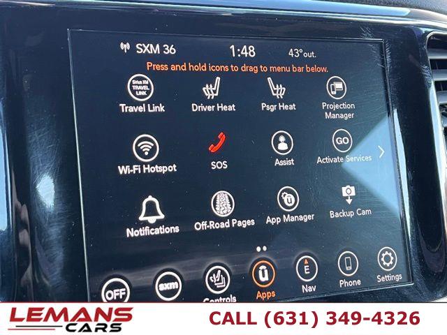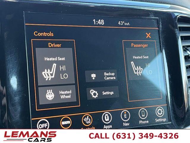 ABS, 4-Wheel Disc Brakes, 8-Speed A/T, A/C, A/T, Adjustable Steering Wheel, Aluminum Wheels, AM/FM Stereo, Transmission w/Dual Shift Mode, Automatic Headlights, Auxiliary Audio Input, Back-Up Camera, Blind Spot Monitor, Brake Assist, Child Safety Locks, Climate Control, Temporary Spare Tire, Cross-Traffic Alert, Cruise Control, Daytime Running Lights, Driver Air Bag, Driver Illuminated Vanity Mirror, Driver Adjustable Lumbar, Driver Vanity Mirror, Multi-Zone A/C, Auto-Dimming Rearview Mirror, Stability Control, Fog Lamps, Four Wheel Drive, Floor Mats, Gasoline Fuel, HD Radio, Heated Mirrors, Intermittent Wipers, Keyless Entry, Keyless Start, Knee Air Bag, Leather Steering Wheel, MP3 Capability, Navigation System, Telematics, Pass-Through Rear Seat, Passenger Air Bag, Passenger Air Bag On/Off Switch, Passenger Air Bag Sensor, Passenger Illuminated Visor Mirror, Passenger Vanity Mirror, Power Door Locks, Power Mirror(s), Power Driver Seat, Power Steering, Power Windows, Privacy Glass, Rear Bench Seat, Rear Collision Mitigation, Rear Defrost, Rear Head Air Bag, Rear Parking Aid, Rear Spoiler, Requires Subscription, Satellite Radio, Front Side Air Bag, Front Head Air Bag, Smart Device Integration, Steering Wheel Audio Controls, Tire Pressure Monitor, Traction Control, Trip Computer, V6 Cylinder Engine, Variable Speed Intermittent Wipers, Immobilizer, WiFi Hotspot, Bluetooth Connection, Woodgrain Interior Trim, Auto On/Off Reflector Halogen Daytime Running Headlamps w/Delay-Off, Body-Colored Door Handles, Body-Colored Front Bumper w/Black Rub Strip/Fascia Accent, Body-Colored Grille w/Chrome Accents, Body-Colored Power Heated Side Mirrors w/Manual Folding, Body-Colored Rear Step Bumper w/Black Rub Strip/Fascia Accent, Chrome Side Windows Trim and Black Front Windshield Trim, Compact Spare Tire Mounted Inside Under Cargo, Deep Tinted Glass, Fixed Rear Window w/Wiper, Heated Wiper Park and Defroster, Front Fog Lamps, Galvanized Steel/Aluminum Panels, Laminated Glass, LED Brakelights, Lip Spoiler, Perimeter/Approach Lights, Rocker Panel Extensions and Black Wheel Well Trim, Speed Sensitive Variable Intermittent Wipers, Steel Spare Wheel, Tailgate/Rear Door Lock Included w/Power Door Locks, Tires: 265/60R18 BSW A/S LRR, Wheels: 18" x 8.0" Fine Silver Aluminum, 12-Way Power Driver Seat -inc: Power Recline, Height Adjustment, Fore/Aft Movement, Cushion Tilt and Power 4-Way Lumbar Support, 2 Seatback Storage Pockets, 3 12V DC Power Outlets, 4-Way Passenger Seat -inc: Manual Recline, Fore/Aft Movement and Fold Flat, 4G LTE Wi-Fi Hot Spot Mobile Hotspot Internet Access, 60-40 Folding Split-Bench Front Facing Manual Reclining Fold Forward Seatback Rear Seat, Air Filtration, Cargo Area Concealed Storage, Cargo Features -inc: Cargo Tray/Organizer, Cargo Space Lights, Carpet Floor Trim, Compass, Cruise Control w/Steering Wheel Controls, Day-Night Auto-Dimming Rearview Mirror, Delayed Accessory Power, Digital/Analog Appearance, Driver And Passenger Visor Vanity Mirrors w/Driver And Passenger Illumination, Driver Information Center, Dual Zone Front Automatic Air Conditioning, Fade-To-Off Interior Lighting, FOB Controls -inc: Keyfob Cargo Access, Front And Rear Map Lights, Front Center Armrest w/Storage and Rear Center Armrest, Front Seats w/Power 4-Way Driver Lumbar, Full Carpet Floor Covering -inc: Carpet Front And Rear Floor Mats, Full Cloth Headliner, Full Floor Console w/Covered Storage, Mini Overhead Console w/Storage and 3 12V DC Power Outlets, Gauges -inc: Speedometer, Odometer, Oil Pressure, Engine Coolant Temp, Tachometer, Oil Temperature, Transmission Fluid Temp, Engine Hour Meter, Trip Odometer and Trip Computer, HVAC -inc: Console Ducts, Illuminated Front Cupholder, Illuminated Locking Glove Box, Instrument Panel Covered Bin, Driver / Passenger And Rear Door Bins, Integrated Navigation System w/Voice Activation, Interior Trim -inc: Simulated Wood/Metal-Look Instrument Panel Insert, Simulated Wood Door Panel Insert, Metal-Look Console Insert and Chrome/Metal-Look Interior Accents, Leather/Metal-Look Gear Shifter Material, Leather/Metal-Look Steering Wheel, Manual Anti-Whiplash Adjustable Front Head Restraints and Fixed Rear Head Restraints, Manual Tilt/Telescoping Steering Column, Outside Temp Gauge, Power 1st Row Windows w/Driver And Passenger 1-Touch Up/Down, Power Door Locks w/Autolock Feature, Power Fuel Flap Locking Type, Power Rear Windows and Fixed 3rd Row Windows, Proximity Key For Doors And Push Button Start, Rear Cupholder, Remote Keyless Entry w/Integrated Key Transmitter, Illuminated Entry and Panic Button, Remote Releases -Inc: Power Fuel, Sentry Key Immobilizer, Smart Device Integration, Smart Device Remote Engine Start, Tracker System, Trip Computer, Valet Function, Voice Recorder, 1370# Maximum Payload, 160 Amp Alternator, 24.6 Gal. Fuel Tank, 3.45 Rear Axle Ratio, 4-Wheel Disc Brakes w/4-Wheel ABS, Front And Rear Vented Discs, Brake Assist and Hill Hold Control, 50 State Emissions, 650CCA Maintenance-Free Battery w/Run Down Protection, Automatic Full-Time Four-Wheel Drive, Electric Power-Assist Speed-Sensing Steering, Engine Auto Stop-Start Feature, Engine Oil Cooler, Engine: 3.6L V6 24V VVT UPG I w/ESS, Front And Rear Anti-Roll Bars, Gas-Pressurized Shock Absorbers, GVWR: 6, 500 lbs, Multi-Link Rear Suspension w/Coil Springs, Normal Duty Suspension, Permanent Locking Hubs, Short And Long Arm Front Suspension w/Coil Springs, Single Stainless Steel Exhaust, Towing Equipment -inc: Trailer Sway Control, Transmission w/Driver Selectable Mode and Sequential Shift Control, Transmission: 8-Speed Automatic (850RE), ABS And Driveline Traction Control, Airbag Occupancy Sensor, Blind Spot Monitoring System Blind Spot, Collision Mitigation-Rear, Curtain 1st And 2nd Row Airbags, Driver Knee Airbag, Dual Stage Driver And Passenger Front Airbags, Dual Stage Driver And Passenger Seat-Mounted Side Airbags, Electronic Stability Control (ESC) And Roll Stability Control (RSC), Outboard Front Lap And