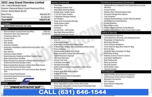 For more information on this 2022 Jeep Grand Cherokee, please call Stream Auto Outlet Islip at (631) 646-1544 or with the contact form on this page. This vehicle's vin number is 1C4RJHBG5N8579640 and is recorded as being in stock at Stream Auto Outlet Islip at 2232 Sunrise Hwy in Islip. See all cars from this dealership.