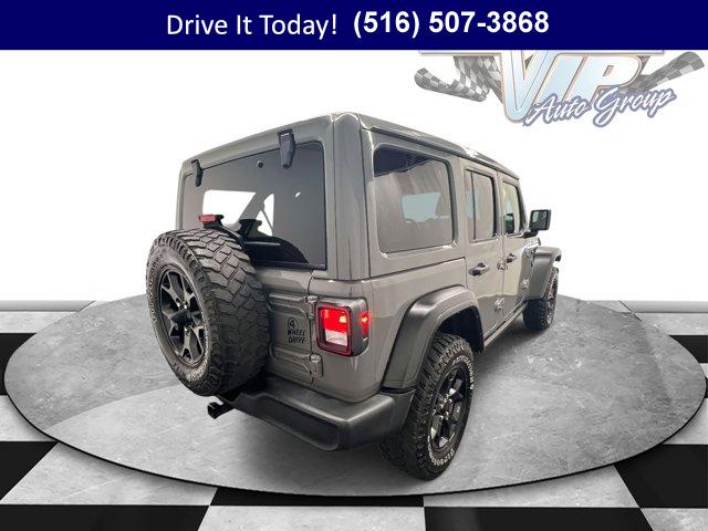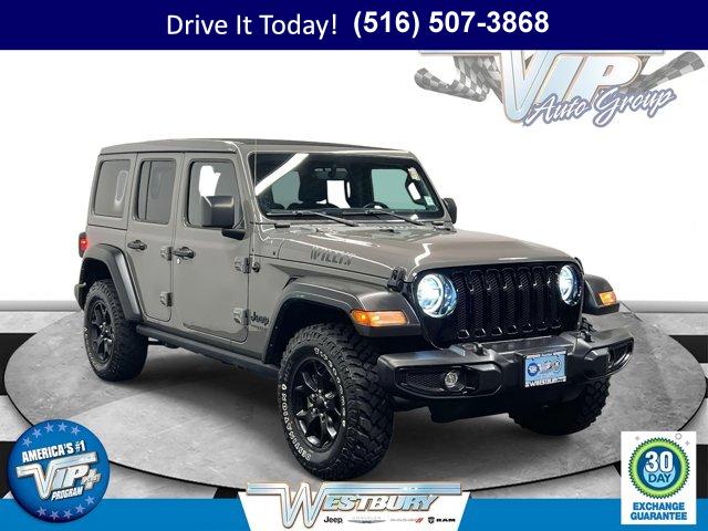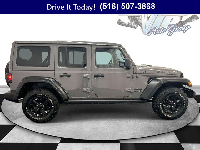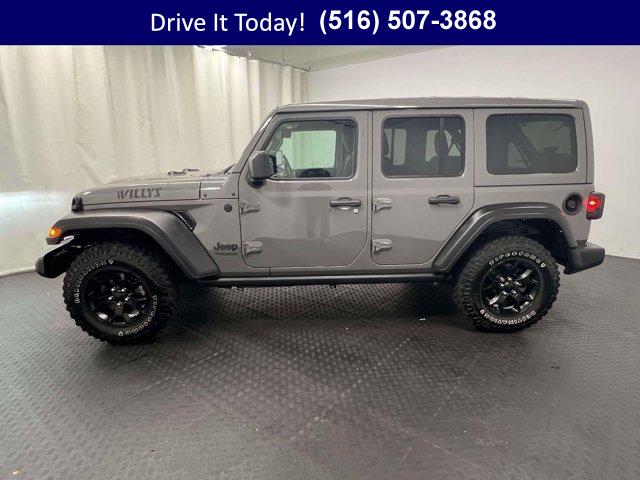 One owner. Sting-Gray Clearcoat exterior and Black interior, Unlimited Willys trim. Heated Seats, Sunroof, Alloy Wheels, CD Player, iPod/MP3 Input, Back-Up Camera, 4x4, Turbo, TRANSMISSION: 8-SPEED AUTOMATIC (850R. SUN AND SOUND PACKAGE, COLD WEATHER GROUP, CONVENIENCE GROUP, TECHNOLOGY GROUP, QUICK ORDER PACKAGE 22W WILLYS, ENGINE: 2.0L I4 DOHC DI TURBO W/ESS.KEY FEATURES INCLUDE4x4, Back-Up Camera, iPod/MP3 Input, CD Player, Aluminum Wheels.OPTION PACKAGESQUICK ORDER PACKAGE 22W WILLYS Engine: 2.0L I4 DOHC DI Turbo w/ESS, Transmission: 8-Speed Automatic (850RE), Willys, Mold In Color Bumper w/Gloss Black, Speed Sensitive Power Locks, Automatic Headlamps, Leather Wrapped Steering Wheel, Black Trail Rated Badge, 4-Wheel Drive Swing Gate Decal, Black Grille, Willys Hood Decal, Rock Protection Sill Rails, Front 1-Touch Down Power Windows, 97 MPH Vehicle Max Speed Calibration, Power Heated Mirrors, Matte Black Jeep Badge, Security Alarm, Remote Keyless Entry, Sun Visors w/Illuminated Vanity Mirrors, Front LED Fog Lamps, LED Premium Reflector Headlamps, SUN AND SOUND PACKAGE Media Hub-2 USBS (Both Charge Only), Rear Window Defroster, Remote USB Port - Charge Only, 115V Auxiliary Power Outlet, Rear Window Wiper/Washer, Removable Rear Quarter Windows, 8.4 Radio & Premium Audio Group, Off-Road Info Pages, SiriusXM Traffic Plus, Alpine Premium Audio System, 220 Amp Alternator, SiriusXM Satellite Radio, SiriusXM Radio Service, HD Radio, Radio: Uconnect 4C Nav w/8.4 Display, Rear View Auto Dim Mirror, Air Conditioning w/Auto Temp Control, 1-Year SiriusXM Guardian Trial, GPS Navigation, SiriusXM Travel Link, 4G LTE Wi-Fi Hot Spot, Emergency/Assistance Call, 8.4 Touchscreen Display, Air Filtering, Power Top Quarter Window Storage Bag, Sky 1-Touch Power Top, Console Bin Task, TRANSMISSION: 8-SPEED AUTOMATIC (850RE) Tip Start, Dana M200 Rear Axle, Selec-Speed Control, COLD WEATHER GROUP Heated Steering Wheel, Heated Front Seats, Leather Wrapped Steering Wheel, TECHNOLOGY GROUP Air Conditioning w/Auto Temp Control, 2-Door Passive Entry, Front Door Locks, Cluster 7.0 TFT Color Display, SiriusXM Satellite Radio, SiriusXM Radio Service, Air Filtering, CONVENIENCE GROUP Universal Garage Door Opener Jeep Unlimited Willys with Sting-Gray Clearcoat exterior and Black interior features a 4 Cylinder Engine with 270 HP at 5250 RPM*.EXPERTS RAVEGreat Gas Mileage: 24 MPG Hwy.WHY BUY FROM USWe hand select the finest automobiles possible, recondition as required so you do not have to worry about anything shortly down the road. Our Certified vehicles for example all have more than 50% brake life, most have brand new brakes installed front and rear and it does not end there.WESTBURY VIPAmericas #1 VIP Plus Program includes Complimentary Loaner Cars, UnlimitedOil & Filter changes for 1 yr. & then included with every factorymaintenance, Courtesy Shuttle to work, home or any other location, ExpressLube 30 minutes or less w/ no appointment necessary, Complimentary NYSI, 24/7 Rescue & Towing.