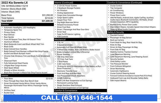 Discover the power and versatility of the 2022 Kia Sorento LX, a standout SUV that blends style, capability, and advanced technology to elevate your driving experience. With its sleek black exterior and a robust 2.5L I4 engine delivering 191 horsepower, this Sorento LX is ready to take on any adventure.