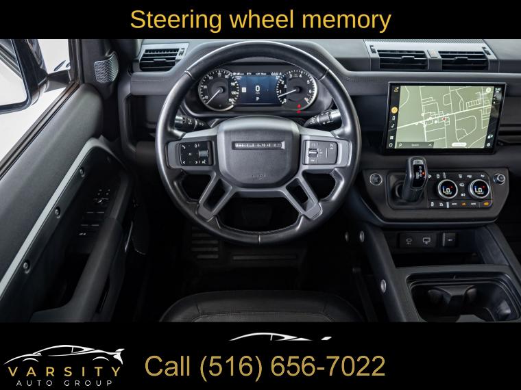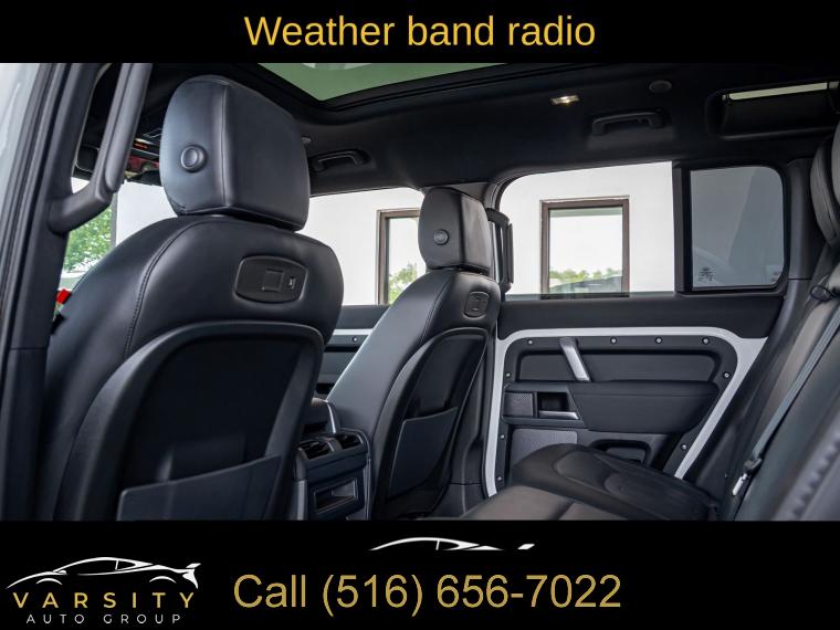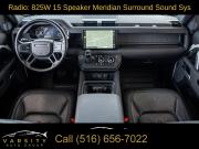 Navigation system: Connected Navigation PIVI Pro, Extended Black Exterior Pack, 15 Speakers, AM/FM radio: SiriusXM, Radio data system, Radio: 825W 15 Speaker Meridian Surround Sound Sys, Weather band radio, Air Conditioning, Automatic temperature control, Front dual zone A/C, Rear window defroster, Memory seat, Power driver seat, Power steering, Power windows, Remote keyless entry, Steering wheel memory, Steering wheel mounted audio controls, Four wheel independent suspension, Speed-sensing steering, Traction control, 4-Wheel Disc Brakes, ABS brakes, Dual front impact airbags, Dual front side impact airbags, Front anti-roll bar, Low tire pressure warning, Occupant sensing airbag, Overhead airbag, Rear anti-roll bar, Power moonroof, Brake assist, Electronic Stability Control, Auto High-beam Headlights, Delay-off headlights, Front fog lights, Fully automatic headlights, Rear fog lights, Panic alarm, Security system, Speed control, Auto-dimming door mirrors, Black Contrast Roof, Bumpers: body-color, Gloss Black Front Grille, Heated door mirrors, Power door mirrors, Roof rack: rails only, 11.4" Touchscreen, 14-Way Heated Electric Memory Seats, Apple CarPlay & Android Auto, Auto tilt-away steering wheel, Auto-dimming Rear-View mirror, ClearSight Interior Rear View Mirror, Compass, Dark Grey Powder Coat Cross Car Beam, Driver door bin, Driver vanity mirror, Front reading lights, Garage door transmitter: HomeLink, Illuminated entry, Leather Shift Knob, Leather steering wheel, Outside temperature display, Overhead console, Passenger vanity mirror, Rear reading lights, Rear seat center armrest, Tachometer, Telescoping steering wheel, Tilt steering wheel, Trip computer, Front Bucket Seats, Front Center Armrest, Grained Leather Seat Trim, Heated front seats, Power passenger seat, Split folding rear seat, Passenger door bin, Trailer Hitch w/Electrical Connector, Alloy wheels, Locking Wheel Nuts, Wheels: 20" Gloss Black Finish Style 6011, Rain sensing wipers, Rear window wiper, Speed-Sensitive Wipers, Variably intermittent wipers, 3.55 Axle Ratio, The Price you See, is the Price You Pay!!!, 2022 Land Rover Defender 110, Clean CARFAX