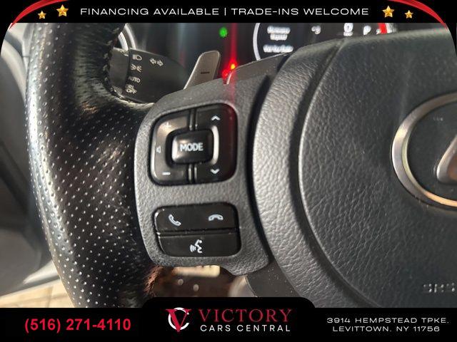Wheels: 19" x 8.5J" Front & 19" x 9.5J" Rear, Heated & Ventilated F SPORT Seats, NuLuxe Seat Trim, Radio: Multimedia System w/8" Color Touchscreen, 4-Wheel Disc Brakes, Emergency communication system: Lexus Enform Safety Connect (with a 3-year trial), Apple CarPlay/Android Auto, Auto High-beam Headlights, Exterior Parking Camera Rear, AM/FM radio: SiriusXM, Compass, Speed-Sensitive Wipers, 10 Speakers, Auto-dimming Rear-View mirror, Ventilated front seats, Variably intermittent wipers, Turn signal indicator mirrors, Trip computer, Traction control, Tilt steering wheel, Telescoping steering wheel, Steering wheel mounted audio controls, Sport steering wheel, Split folding rear seat, Speed-sensing steering, Speed control, Security system, Remote keyless entry, Rear window defroster, Rear side impact airbag, Rear seat center armrest, Rear reading lights, Rear anti-roll bar, Rain sensing wipers, Radio data system, Power windows, Power steering, Power passenger seat, Power driver seat, Power door mirrors, Passenger vanity mirror, Passenger door bin, Panic alarm, Overhead console, Overhead airbag, Outside temperature display, Occupant sensing airbag, Low tire pressure warning, Knee airbag, Illuminated entry, Heated steering wheel, Heated front seats, Heated door mirrors, Garage door transmitter: HomeLink, Fully automatic headlights, Front reading lights, Front fog lights, Front dual zone A/C, Front anti-roll bar, Four wheel independent suspension, Dual front side impact airbags, Dual front impact airbags, Driver vanity mirror, Driver door bin, Delay-off headlights, CD player, Bumpers: body-color, Brake assist, Automatic temperature control, Auto-dimming door mirrors, Alloy wheels, Adjustable head restraints: driver and passenger w/tilt, ABS brakes, Tachometer, Spoiler, Leather Shift Knob, Front Center Armrest, Front Bucket Seats, Electronic Stability Control, Air Conditioning