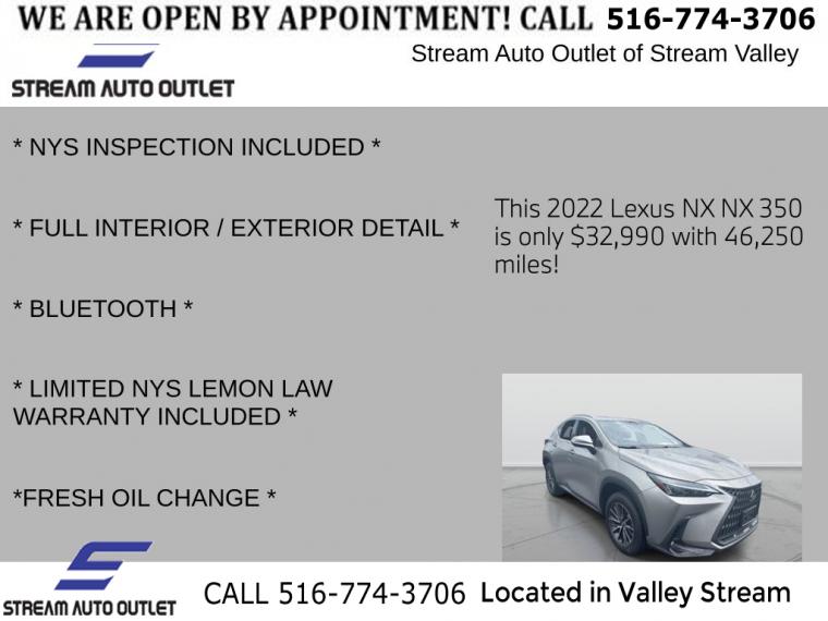 For more information on this 2022 Lexus NX, please call Stream Auto Outlet Valley Stream at (516) 774-3706 or with the contact form on this page. This vehicle's vin number is JTJAGCEZ9N5003673 and is recorded as being in stock at Stream Auto Outlet Valley Stream at 324 W Merrick Rd in Valley Stream. See all cars from this dealership.